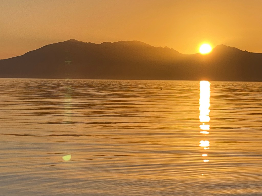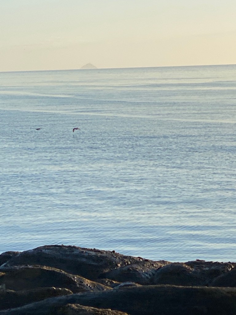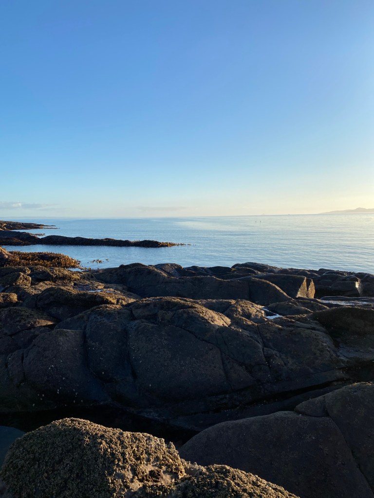 I’m sitting on a large barnacled rock, beside the calmest sea I have seen in a very long time.