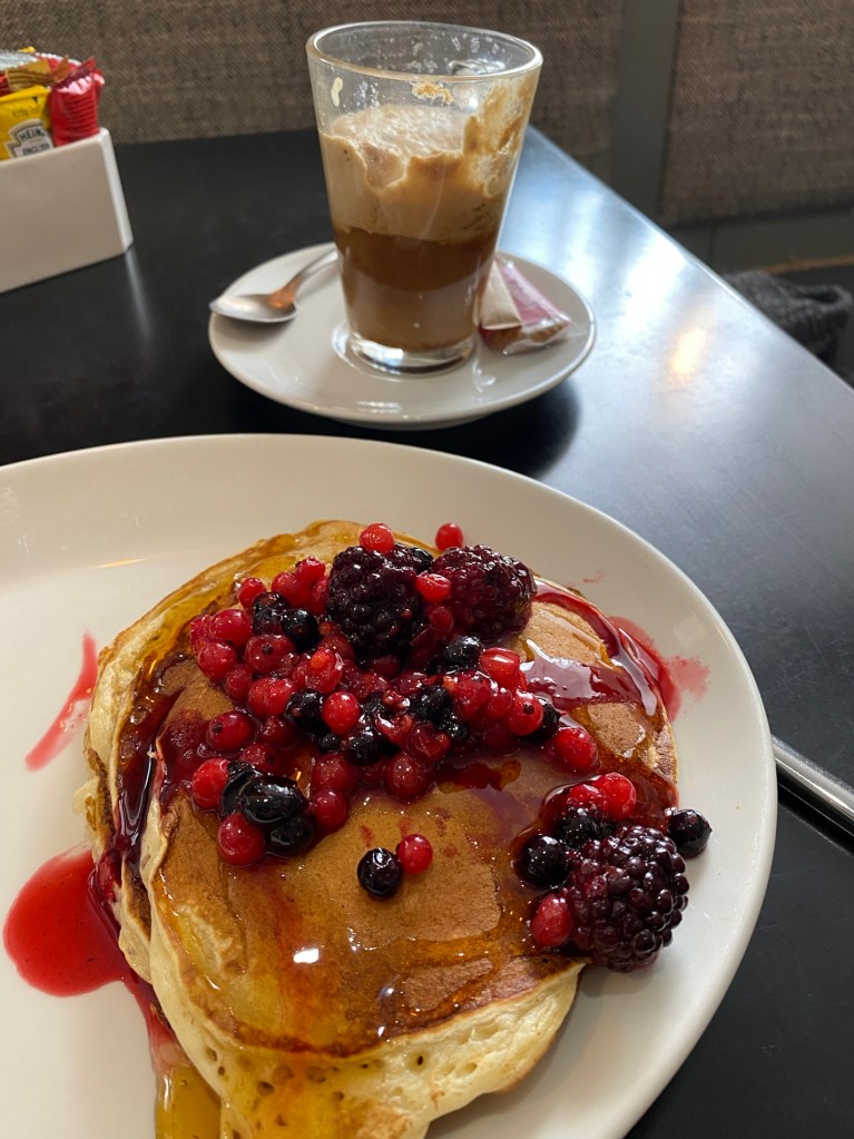 I had pancakes with berry compote, maple syrup and a Soya Milk Latte…. Forgot to ask for decaf 🤦🏻♀️🤷🏻♀️🤣
