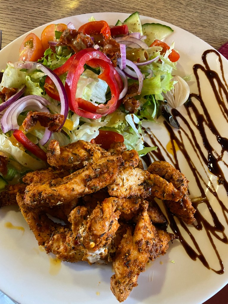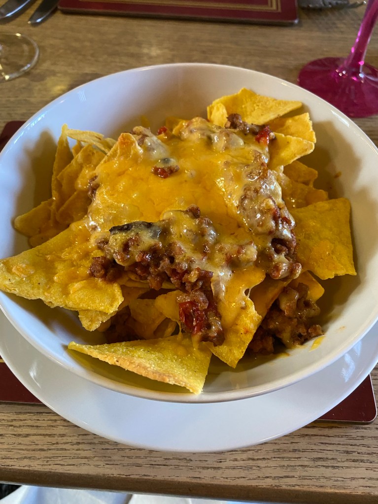 We had a lovely meal and I actually passed on dessert…. Check me! I had nachos to start and Cajun chicken salad for mains.