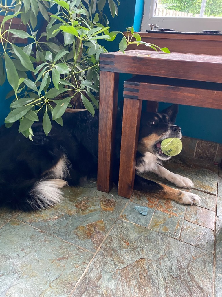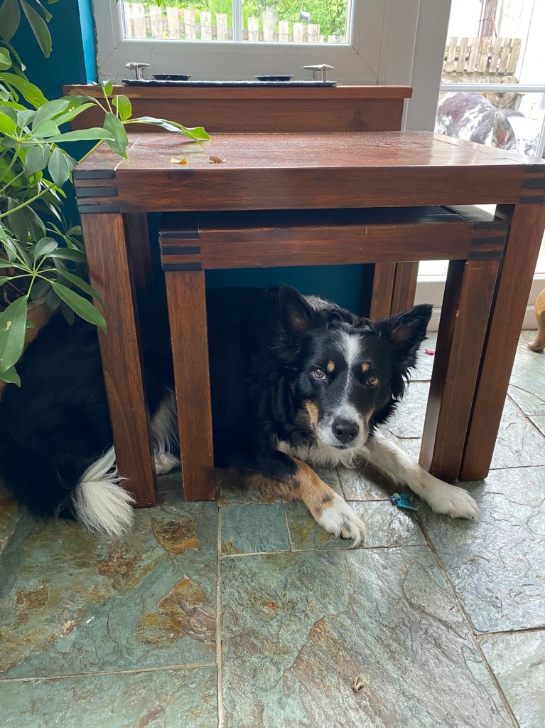 Calaidh has a new place to hide these days. We always sit in the sun room with coffee at the weekend.