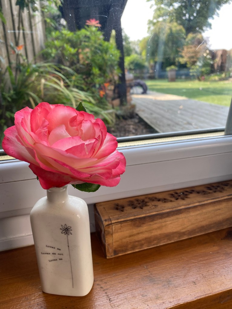 I did knock one of my lovely roses off the rose bush… such a shame but it looks beautiful in this bud vase.