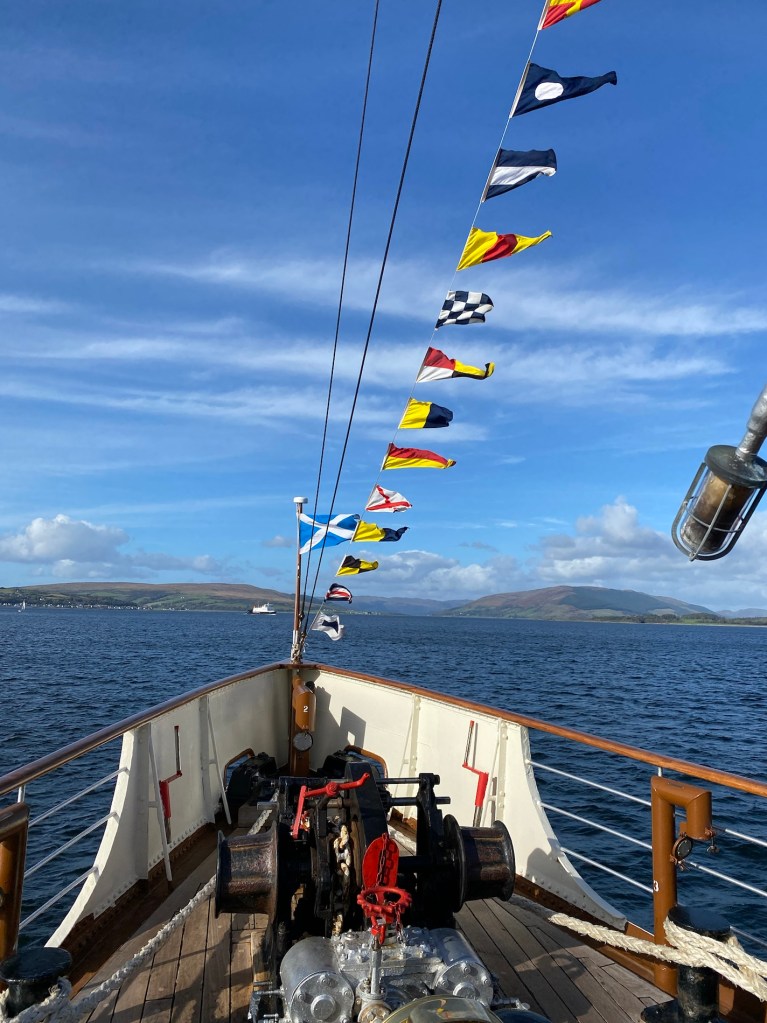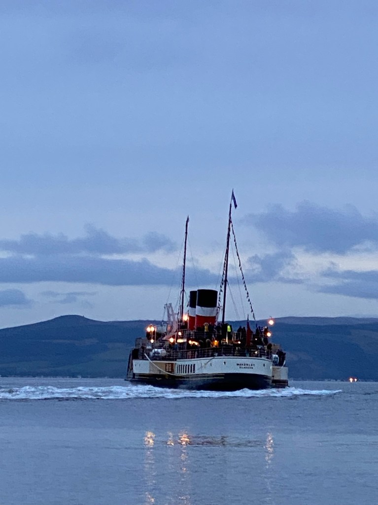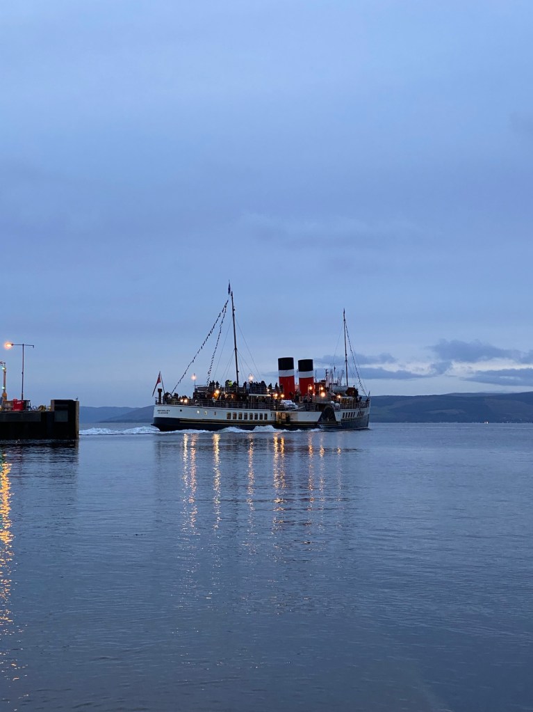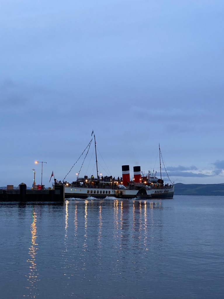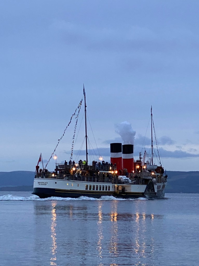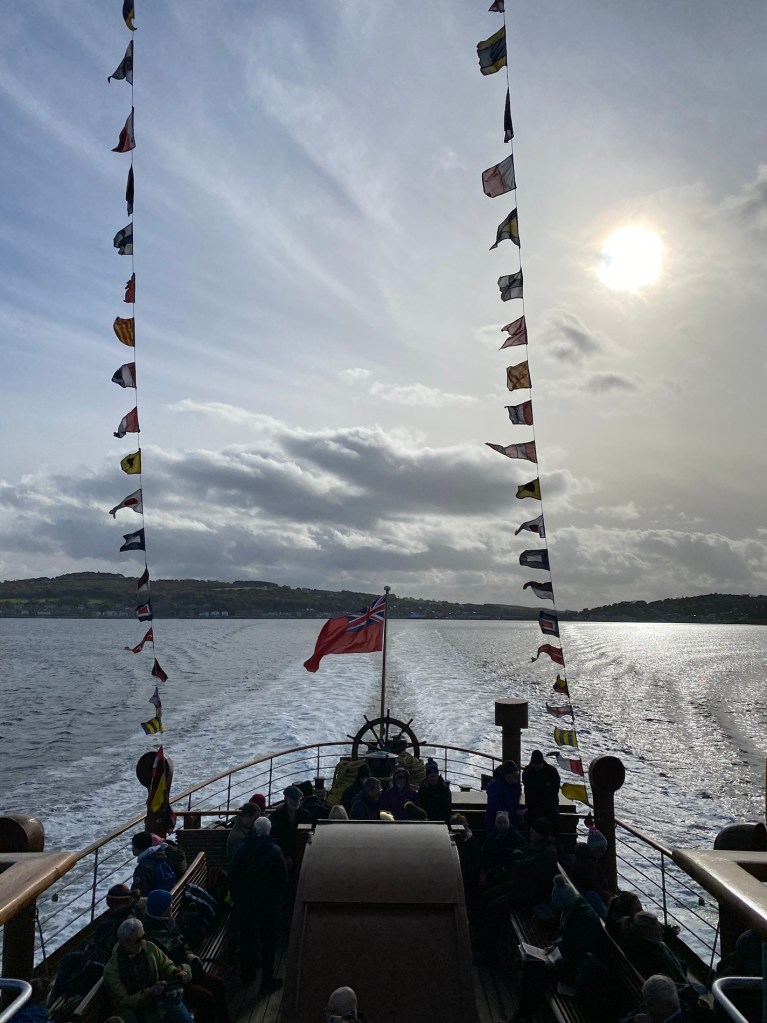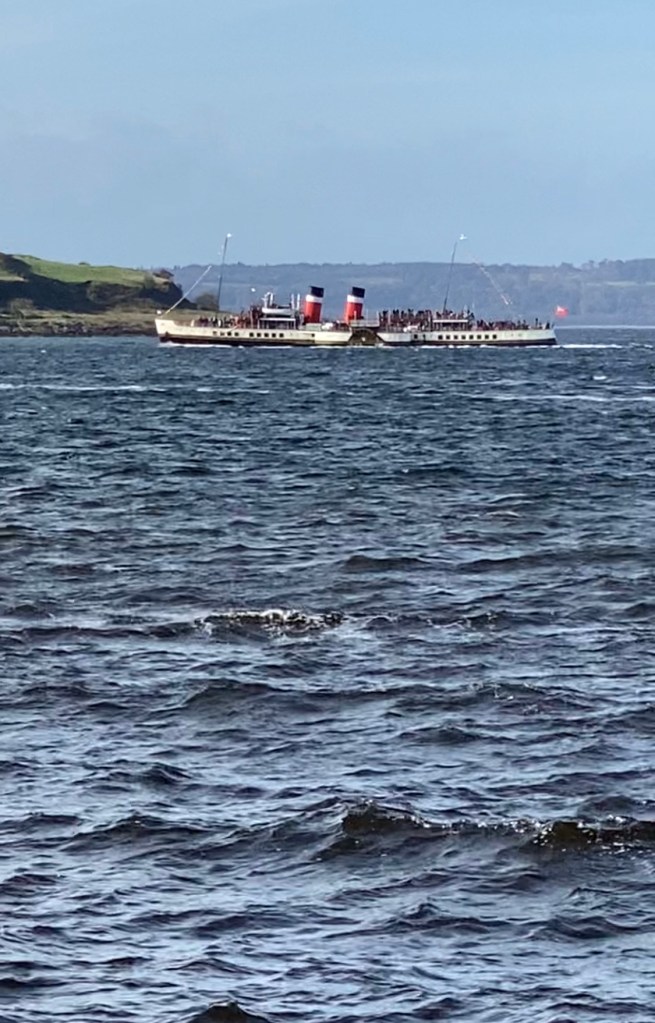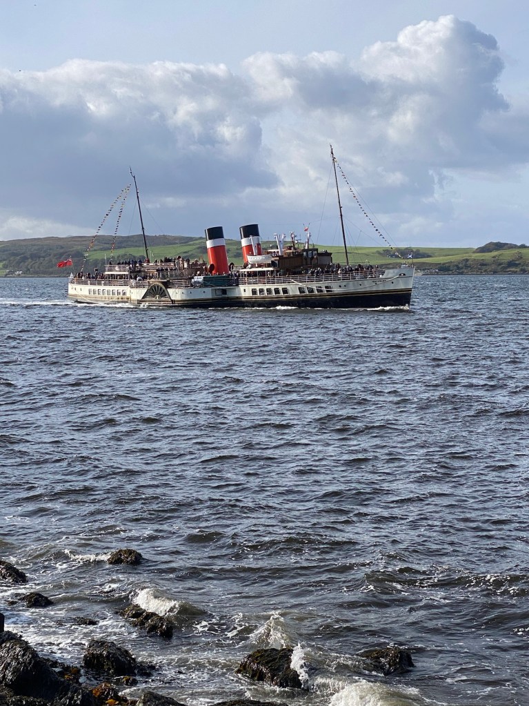 So we have a wee “village” day trip to Largs to pick up the PS Waverley and cruise over to Rothesay on Bute, then to Tighnabruaich then down to Scaplsie Bay and Inchmarnock on the west coast of the Isle of Bute and back the way we can I believe. It’s been a rough week weather wise but we seem to be lucky enough to have a wee window of calm and sunshine this afternoon…. Fingers crossed.