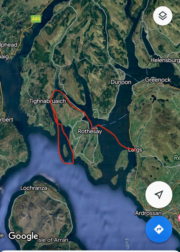 We were sailing from Largs on the west coast of Scotland, out to Rothesay on the Isle of Bute, then to Tighnabruaich on the mainland, down past Ettrick and Scalpsie Bays on Bute and around Inchmarnock island and back the way we came, stopping at each port on the way.