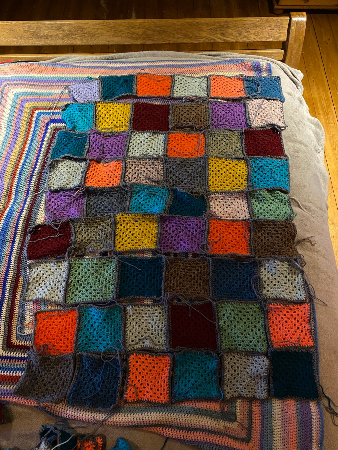 My blanket is coming together nicely. Craig has the dogs watching football in the other room. Every now and then one of them sneaks out and bounds all over the blanket 🤦🏻♀️🤷🏻♀️😂 don’t know why I have a laughing emoji….. 😂😂
