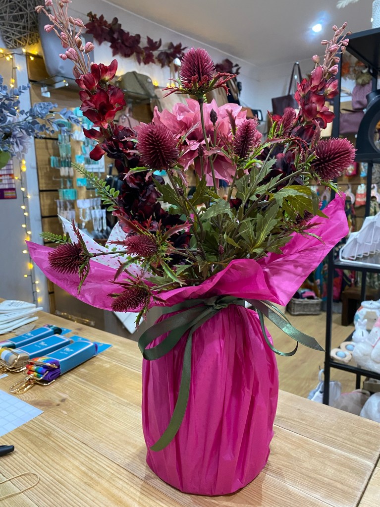 A customer came in looking for a lovely vase and wanted some flowers in it. Gayle used to be a florist…. Look what she did!!!