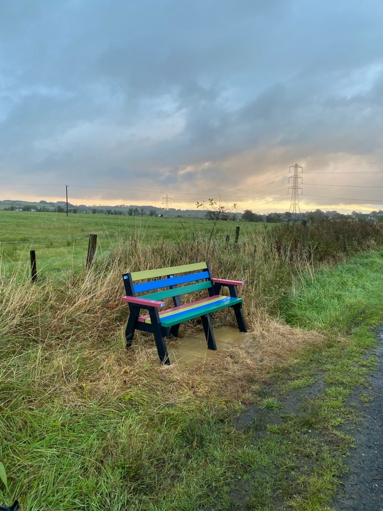 There was a red sky this morning. I took a photo of this Garnock Valley painted bench, these are dotted around the valley to boost mental health.