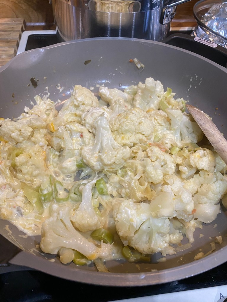 I made cauliflower cheese for dinner today⦠cauliflower and leek cheeseā¦. It was super tasty and I enjoyed making it rather than just opening a bag of crisps or some chocolate.