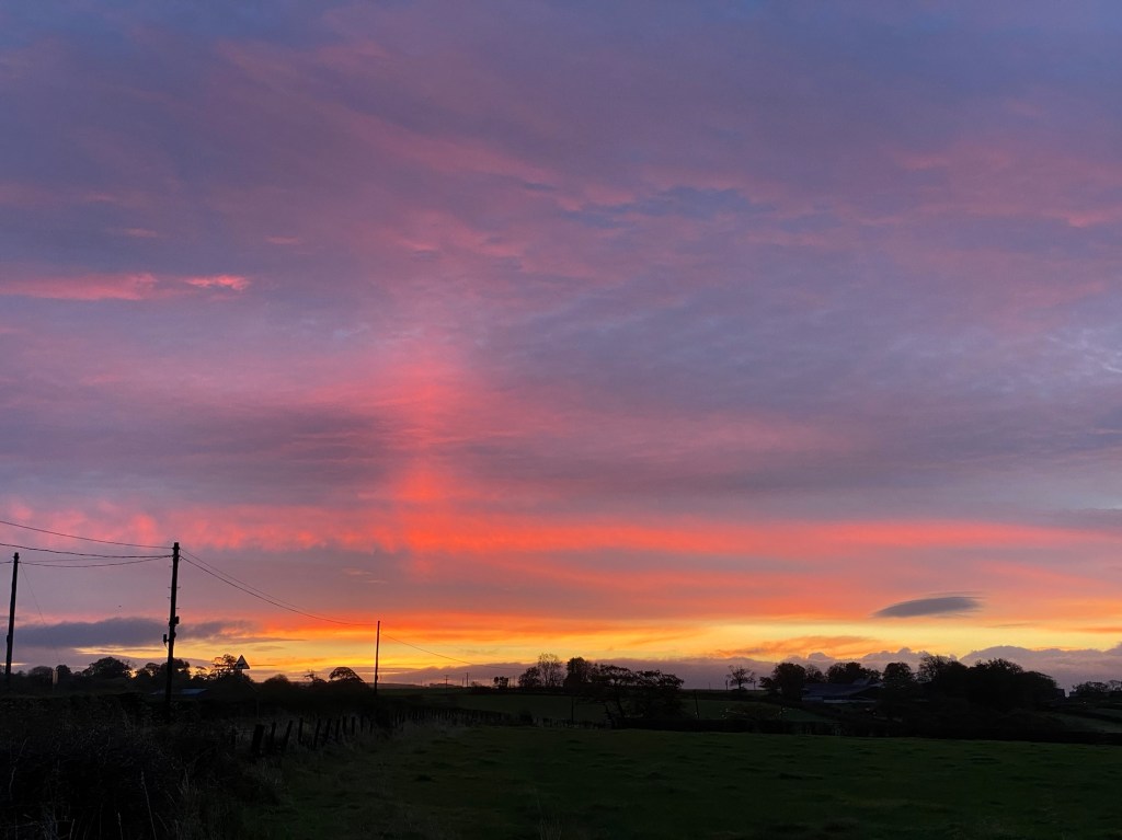 There was a red sky this morning. I took a photo of this Garnock Valley painted bench, these are dotted around the valley to boost mental health.
