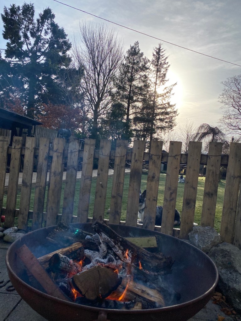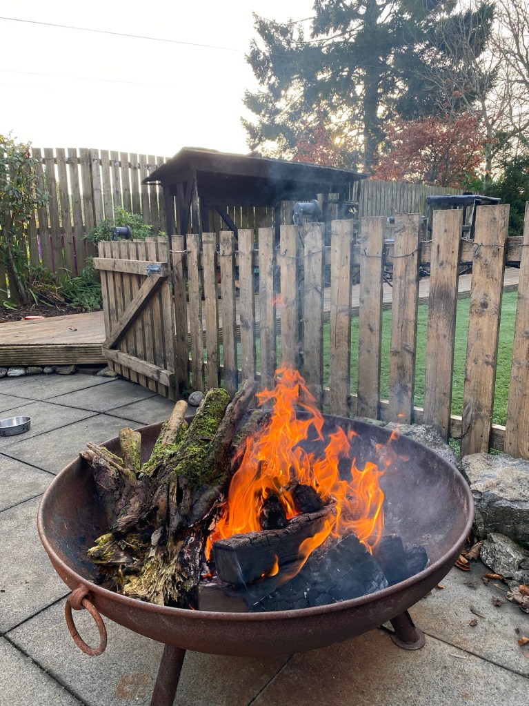 It’s nearly 6pm and I can’t think what to have for dinner so I’m back outside at the dying embers of the fire, where we started the day.