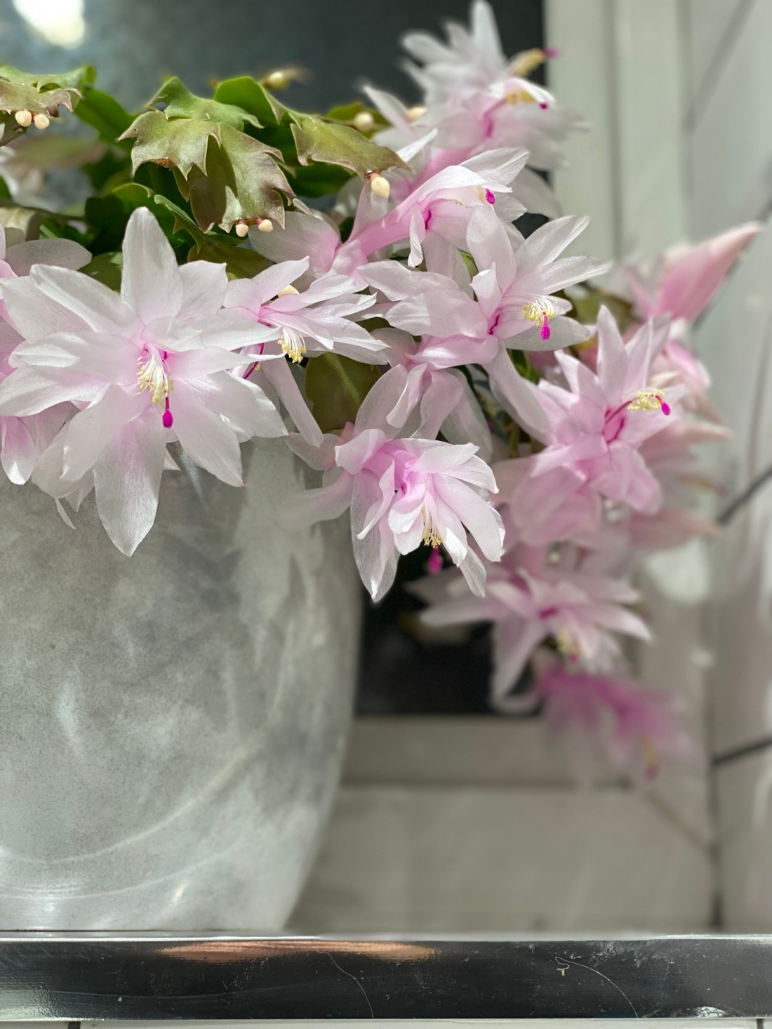 My Gran’s Christmas cactus is blooming at the moment. Mum has a cutting from the same plant but her flowers are darker pink when they bloom.