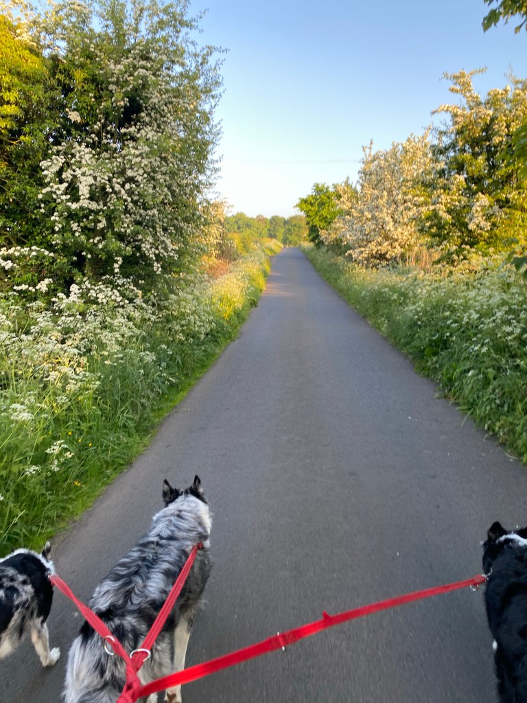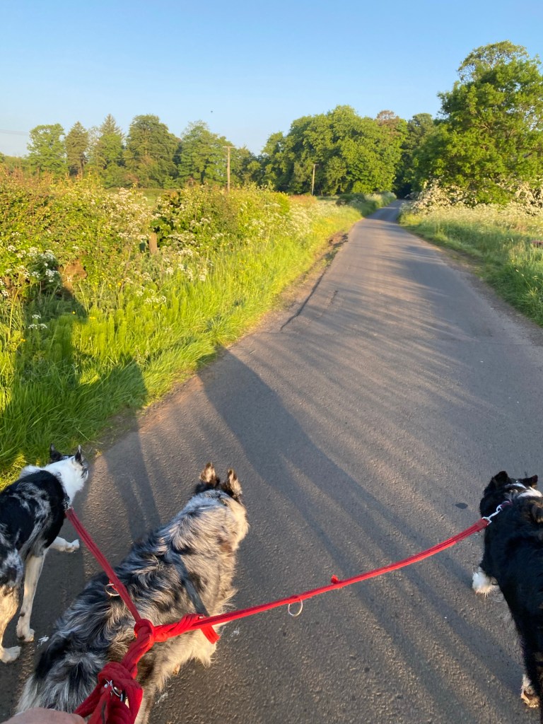It was a beautiful morning! Pure blue sky. T-shirt weather and very sleepy dogs.. not certain they were ready for dog jog at that time of the morning!
