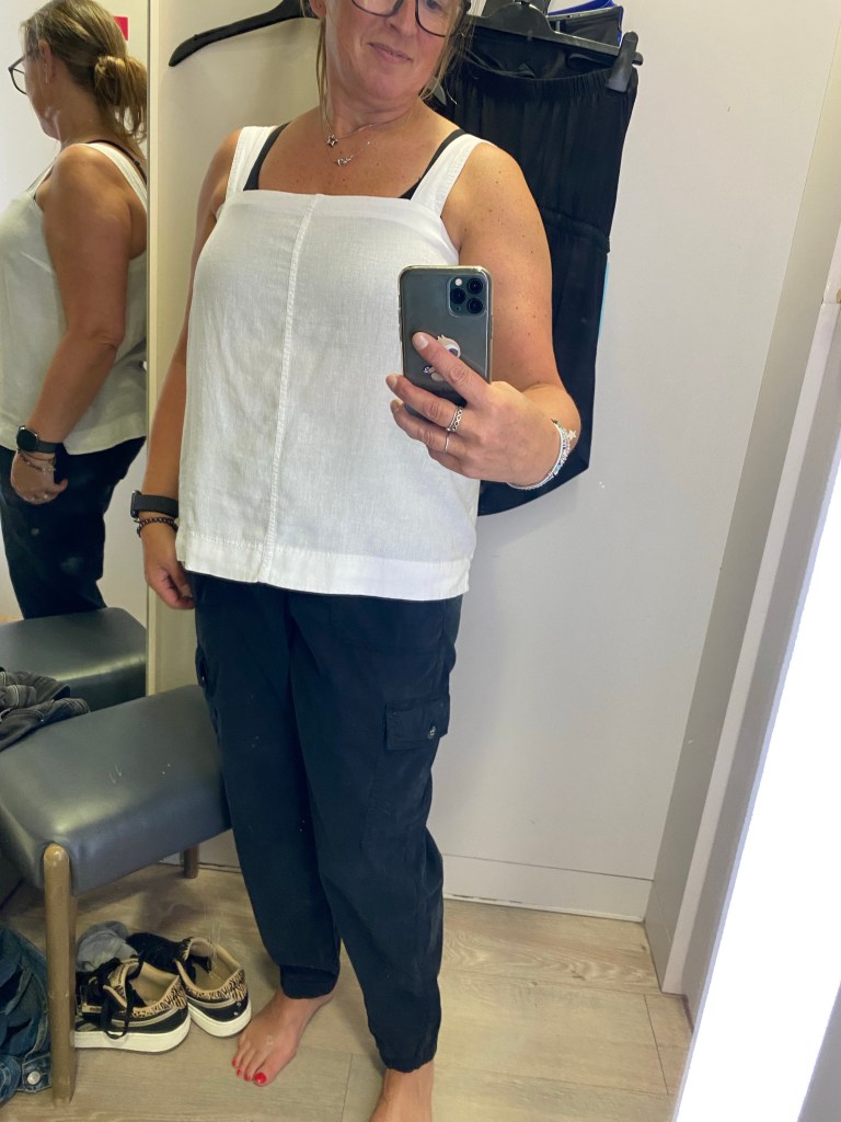 I loved this linen vest top but it just didn’t look right on. Too square at the top and straight up and down. I got the black cargos but I don’t think I need both them and the grey ones. Might take the black ones back.