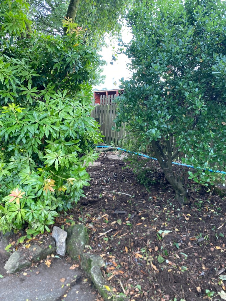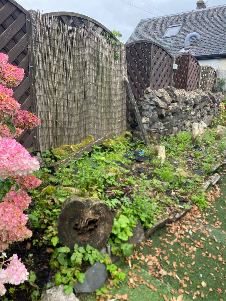 The ground still looks covered in weeds but it’s amazing compared to what it was before. We also had to shore up the giant hydrangea as it’s been falling down with its own weight.