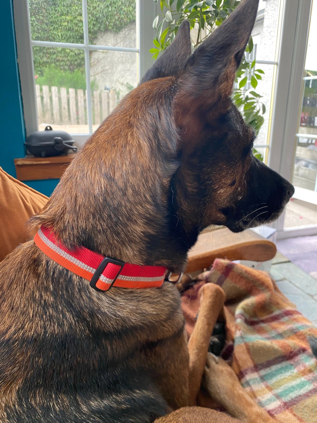 Khaleesi sporting her new collar. Makes her one of the gang. Calaidh’s is purple and pink, Bhru’s green, Freya’s is grey but they’re all the same style.