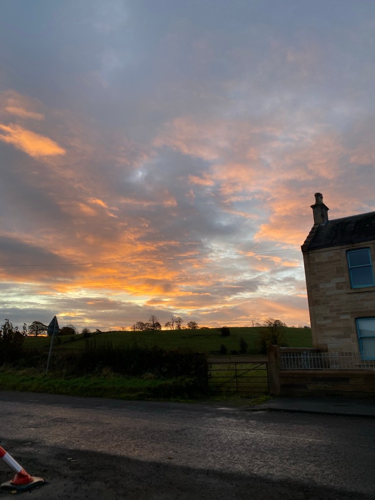 I was awake at 6am… as usual and heading out with Calaidh, Bhruic and Freya before it even got light. (Sorry, Evelyn!). I did have my hi vis vest on and a head torch though so I was very visible. It got light pretty quickly as I walked. I forgot to pick up my phone but the sunrise was lovely and red.