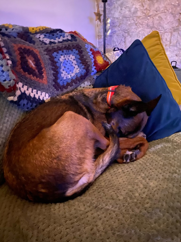 Back in for dinner and look at Khaleesi sleeping on the couch.