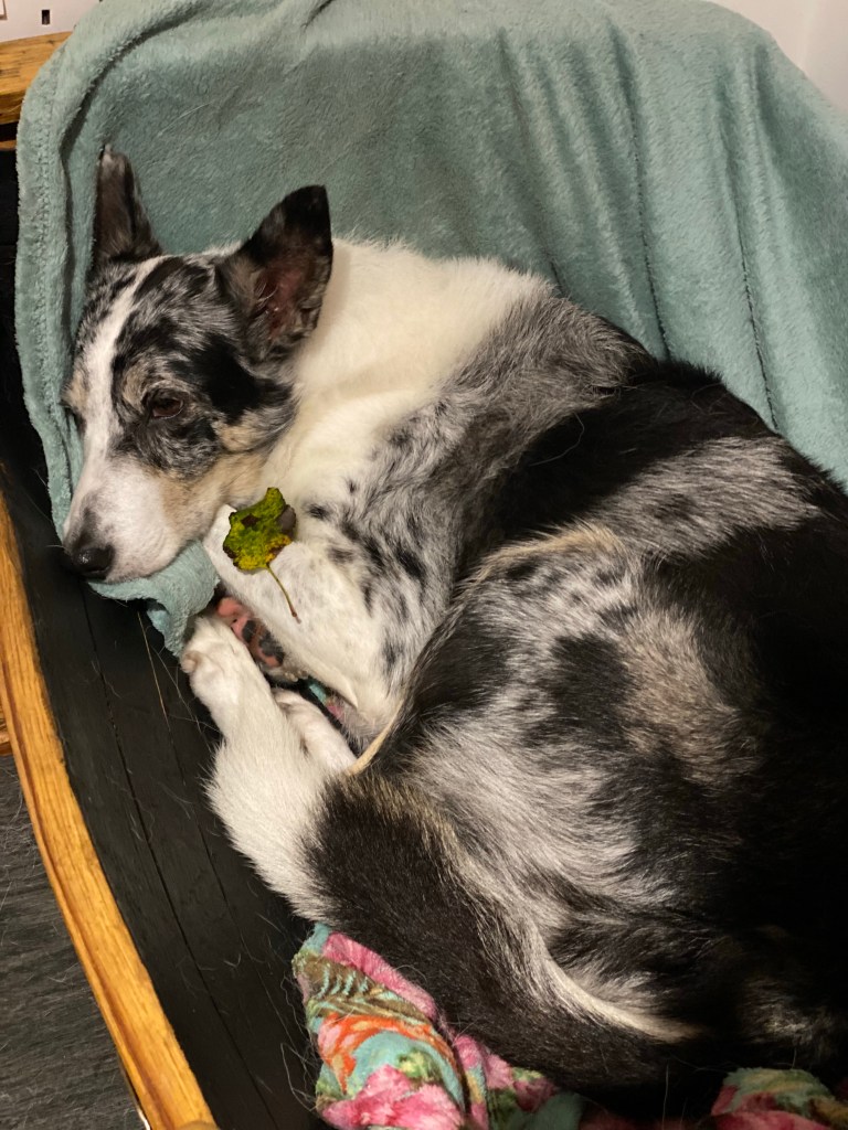 Freya took a leaf to bed with her last night. Anyone who knows Freya will know that she always has to pick something up in her mouth before she does anything exciting 🤦🏻♀️😂