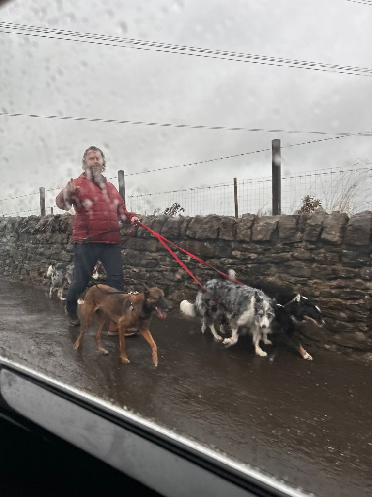 On the way home we passed Craig in the pouring rain walking the dogs!! He got soaked.