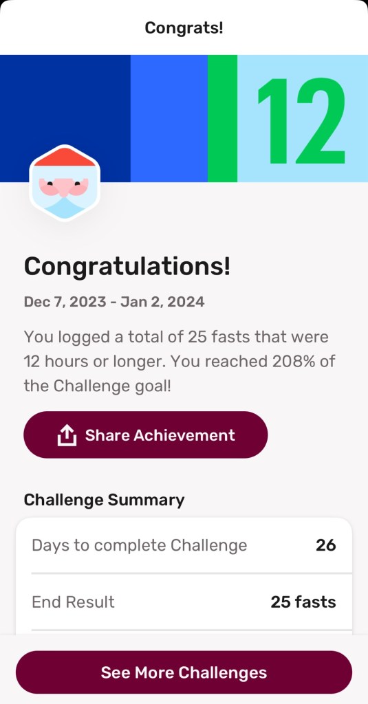I also managed 25 out of 26 fasts 12 hour fasts in December. I’d signed up to do 12 lots of 12 hours! Yesterday I had to hit the button at 11 hours and 57 minutes…. I should have waited those 3 minutes but I forgot about the challenge. 😂😂