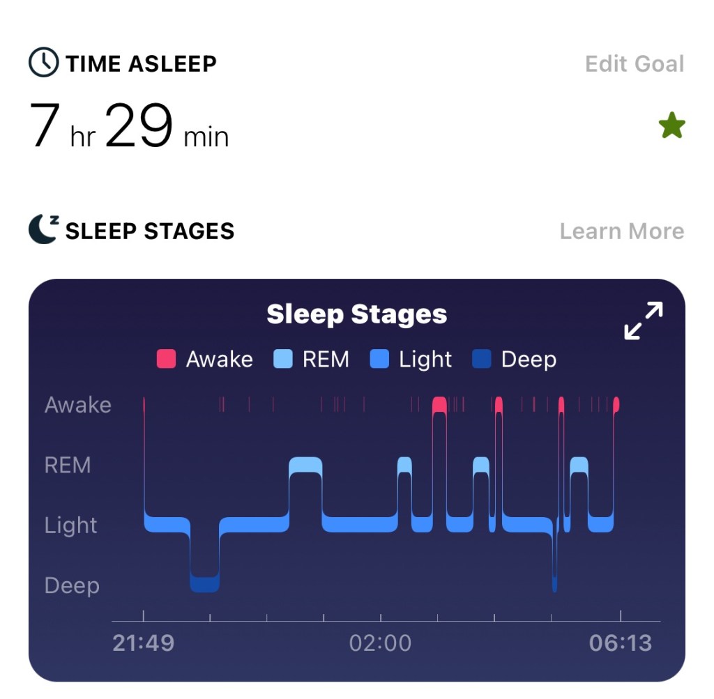 I had a more broken sleep last night. 7 hours 29 looks good but I felt like I was awake from 3am. My knee wasn’t agony but it kept twinging and waking me up.