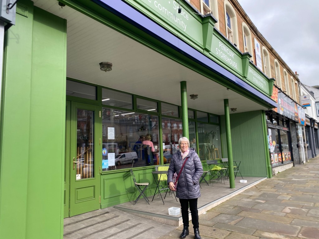 Here she is outside the Penicuik Storehouse where we end for coffee.