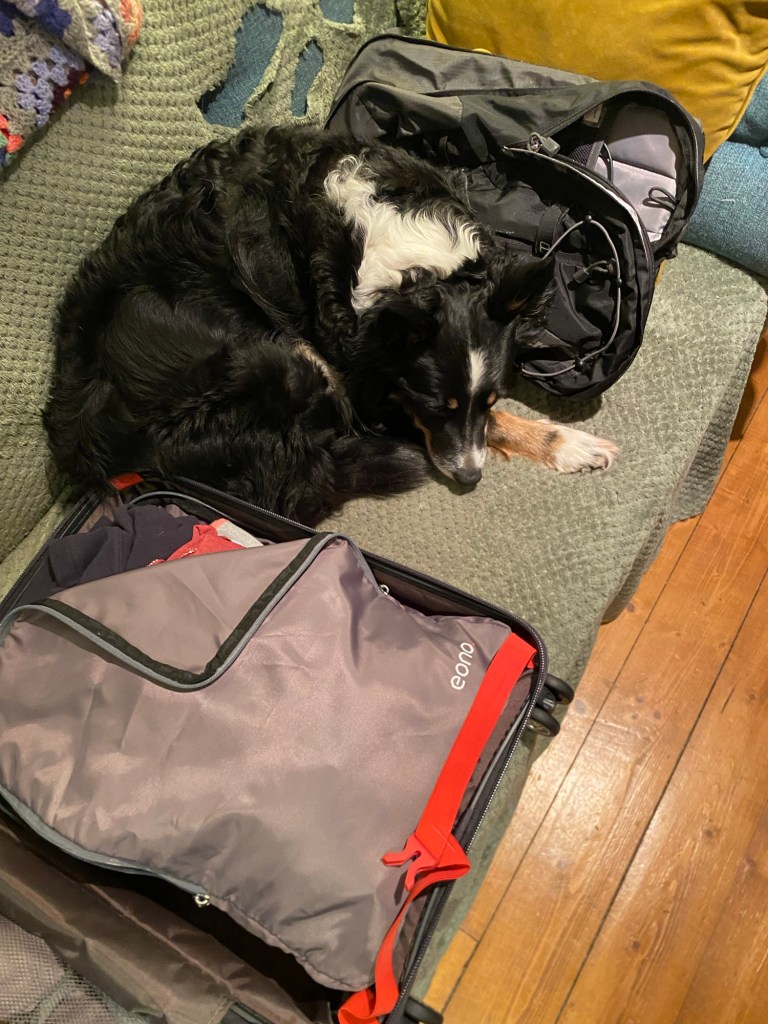 Those holes in the blanket over the couch were made by “someone” trying to bury a bone the last time I went away overnight… what could possibly go wrong this time?!?