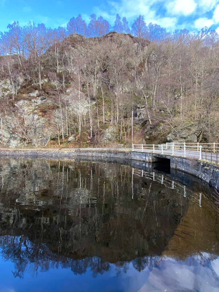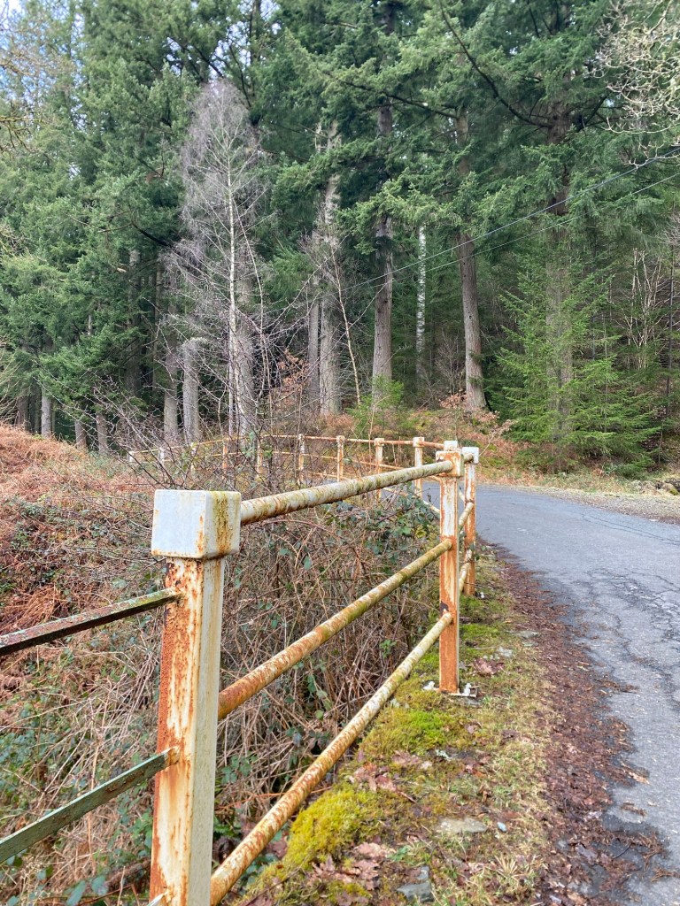 The road alongside the loch is slightly wider than single track but an old style waterworks road with rusty old railings, very pretty in itself.