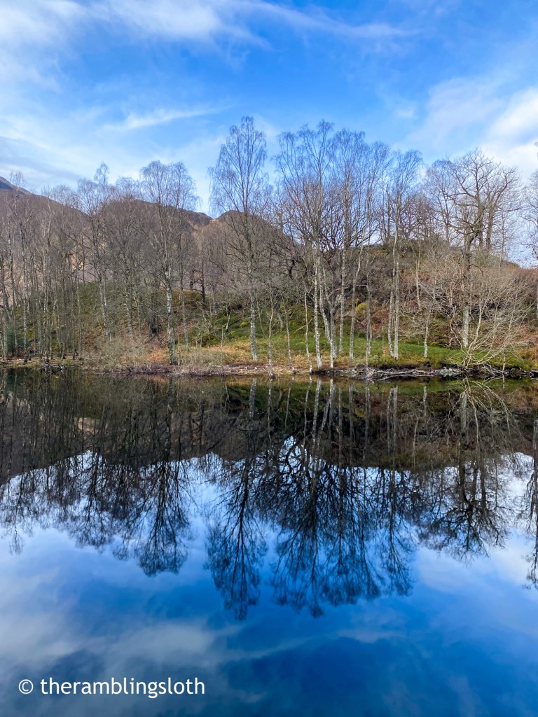 The morning sunlight made everything stand out. The colours were very autumnal. The mountains were very brown as the heather isnāt growing yet, the ferns were a beautiful rusty red/brown and any water I passed was like glass. It honestly took my breath away.