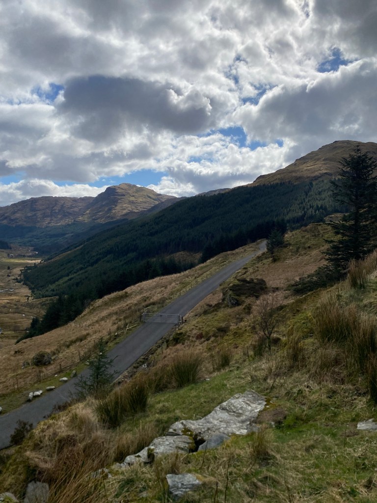 We get to the turning for Lochgoilhead and the road goes down to single track, with passing places. It’s not a great single track either but a very crumbly road with steep verges at either side, if you pull off the tarmac there’s a chance you might not get back up onto it.. my anxiety heightens a little. I’m relieved that I didn’t know this in advance!