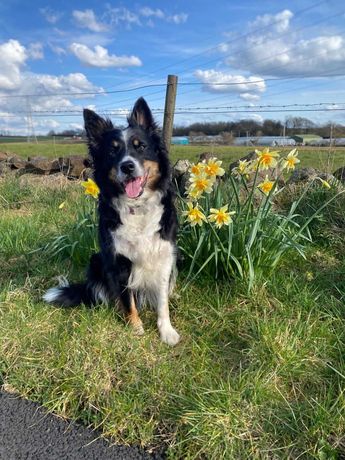 I took Calaidh for a walk up the hill and got her to pose next to some daffodils. She’s a good girl…