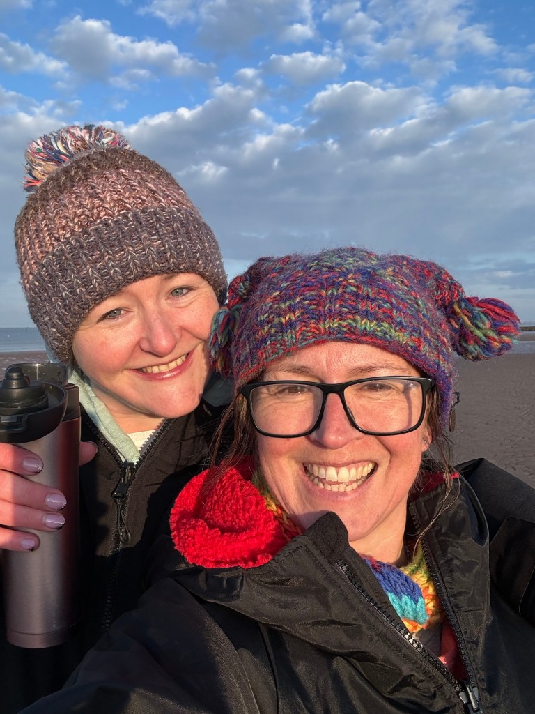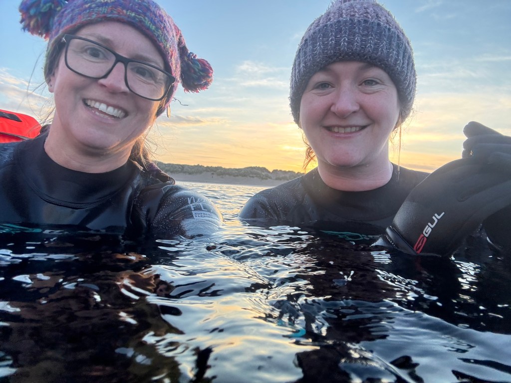 Elly had messaged me on Thursday to ask if I was free to do a sea dip with her this morning. One thing led to another and it ended up being for sunrise (which is no mean feat at this time of year!) and in wetsuits, one of which Elly had to buy quickly! I don’t think I could go in without a wetsuit. I find the cold completely breathtaking in a wetsuit. Hats off to anyone who does that length of time without one!!