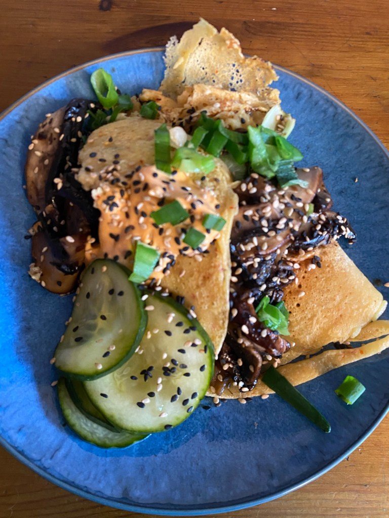 Kimchi Pancakes With Sticky Soy Portobellos, Gochujang Mayo & Pickled Cucumbers