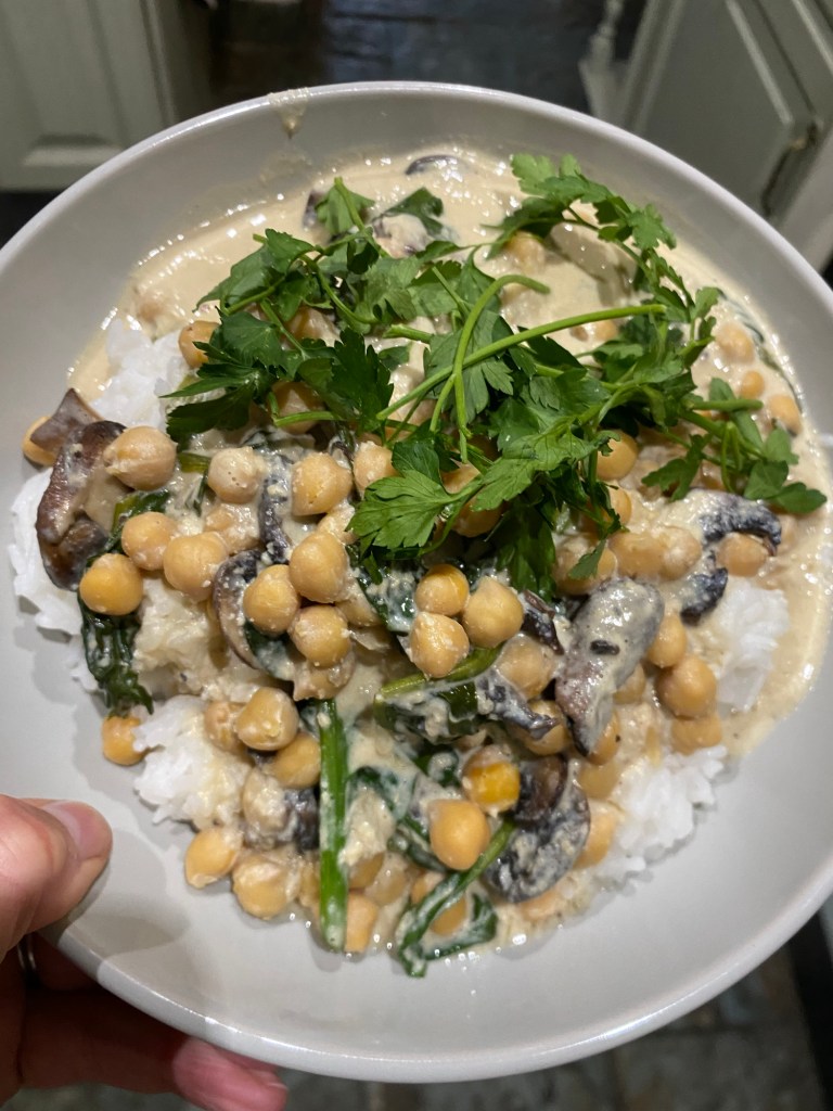 The photo on the recipe shows mushroom stroganoff… mine shows chickpea (with mushroom) stroganoff 😂😂 it’s a bit runnier than it should be but it tastes lovely.