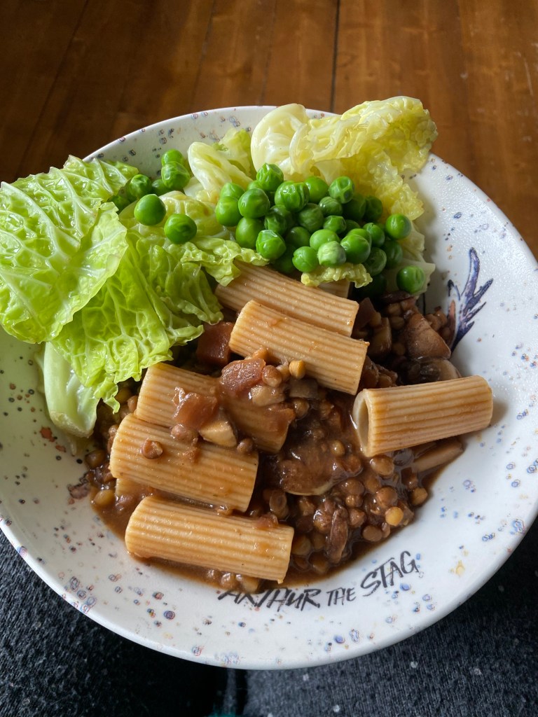I even made myself some mushroom and lentil rigatoni for lunch. I’m eating fine, I’m hungry which is good.