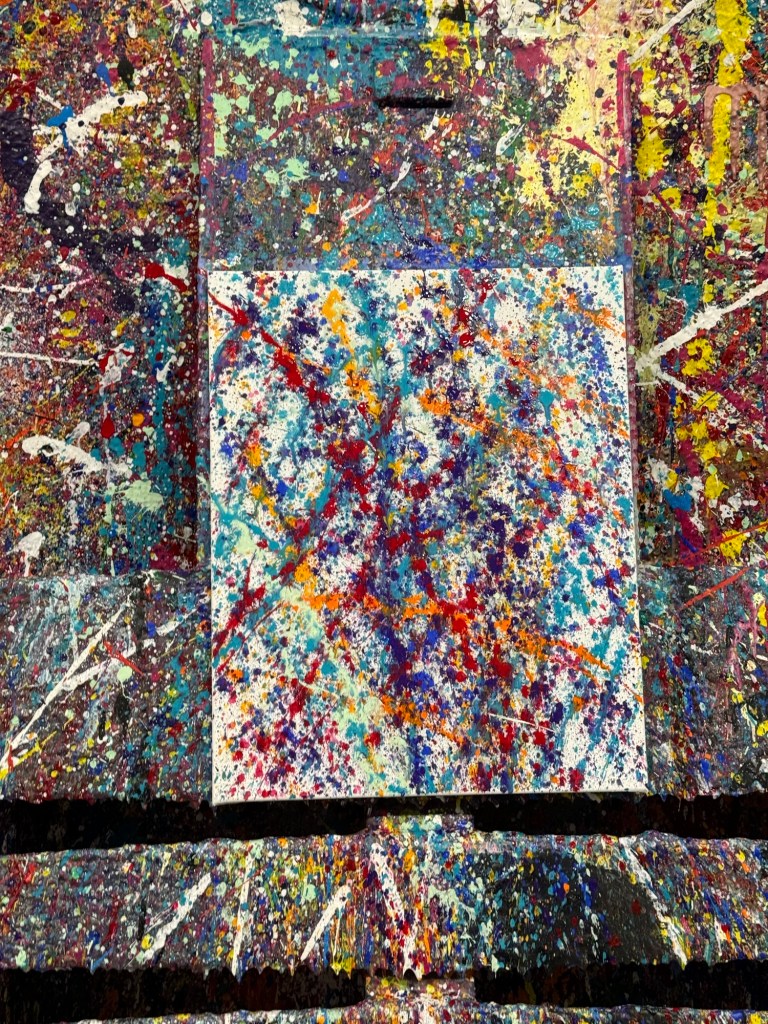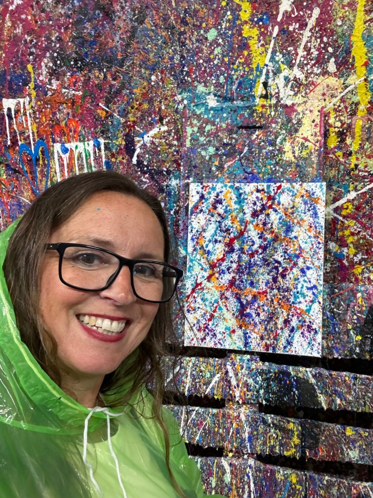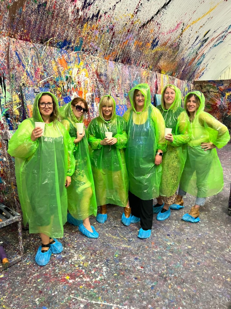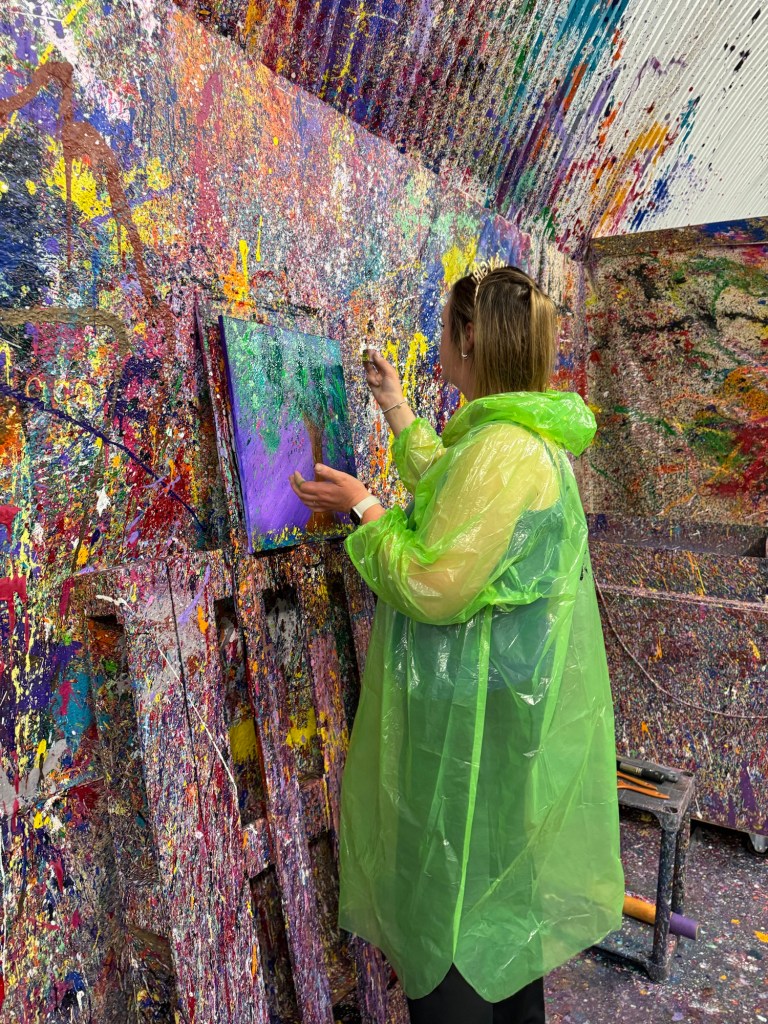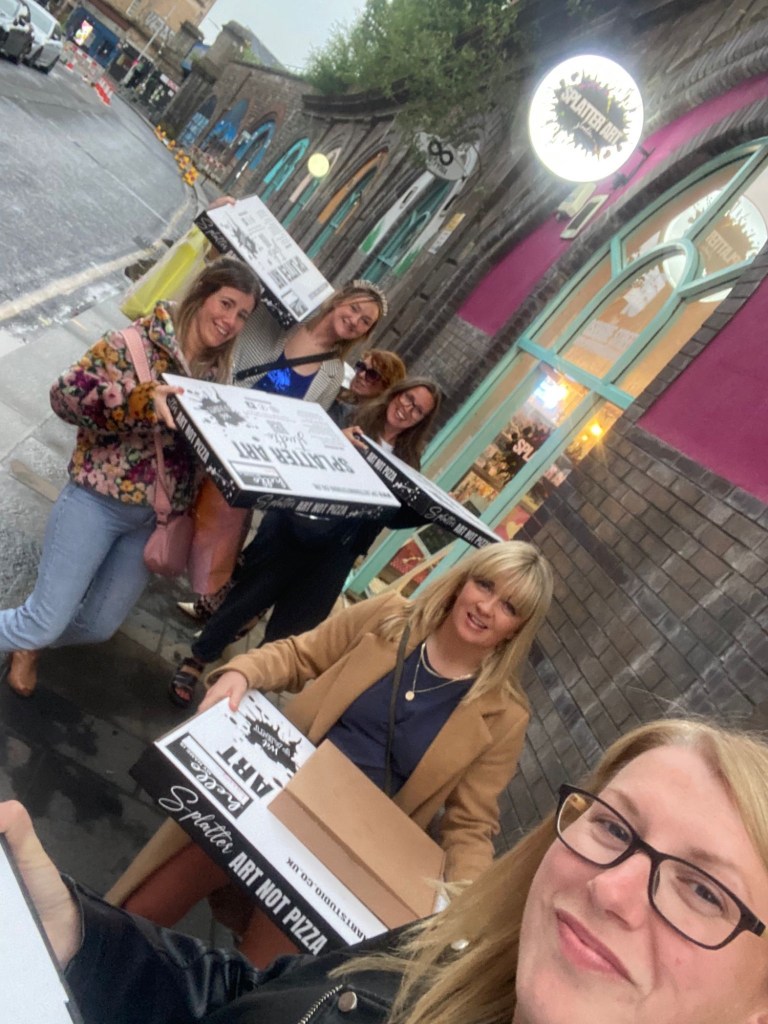 It was raining by the time we came out of Pizza Punks and we tried to get a taxi, but ended up walking to Splatter Art Glasgow where we were to design our own splatter art!