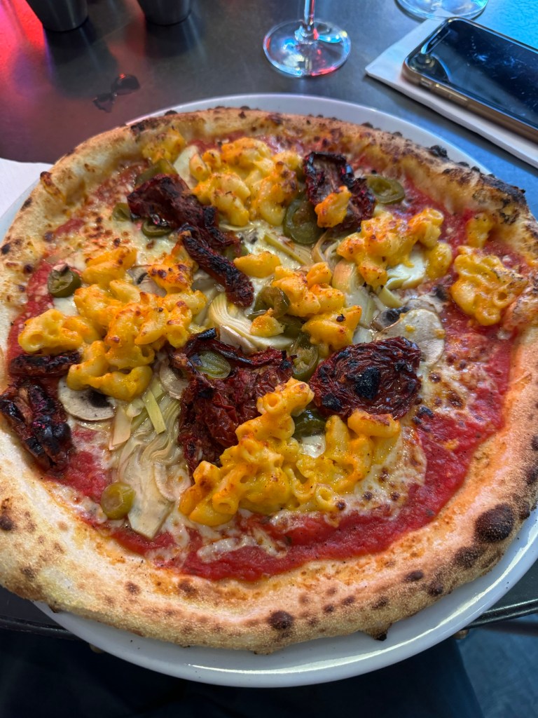 I and had the most amazing pizza⦠I picked ācreate your ownā with artichoke, mushroom, sundried tomato and candied chilliās.