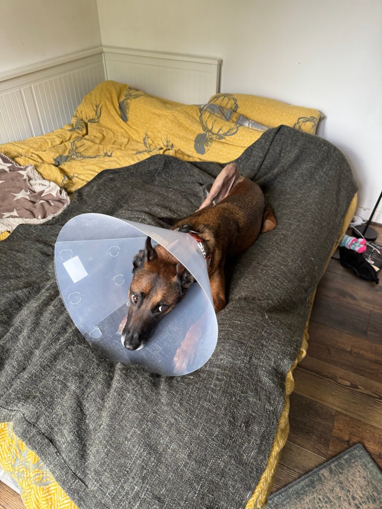 And now for the hard part. The cone of shame for the next 4-5 days at least, to stop her from licking the wound.