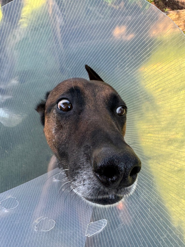 Here she is just out of the vet. The cone doesn’t work well either big ears 😂