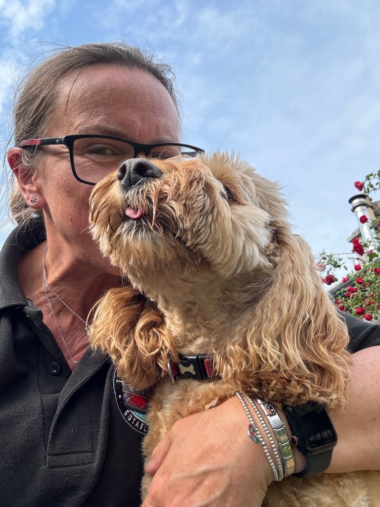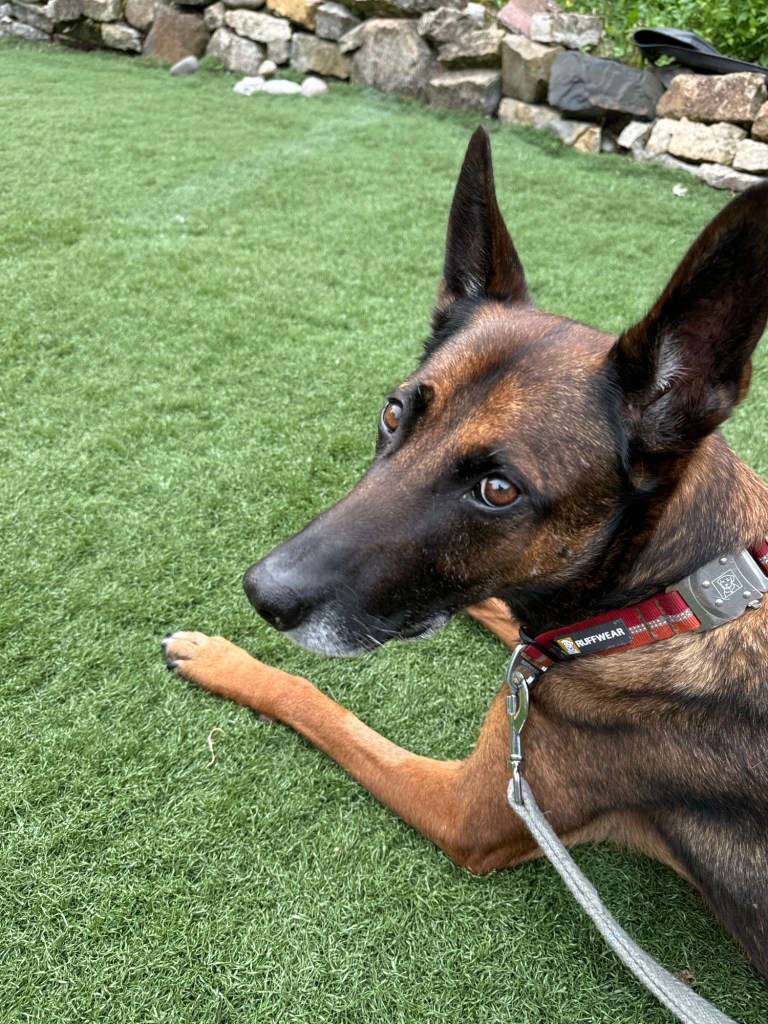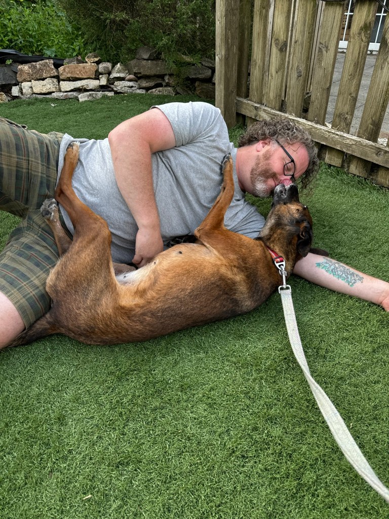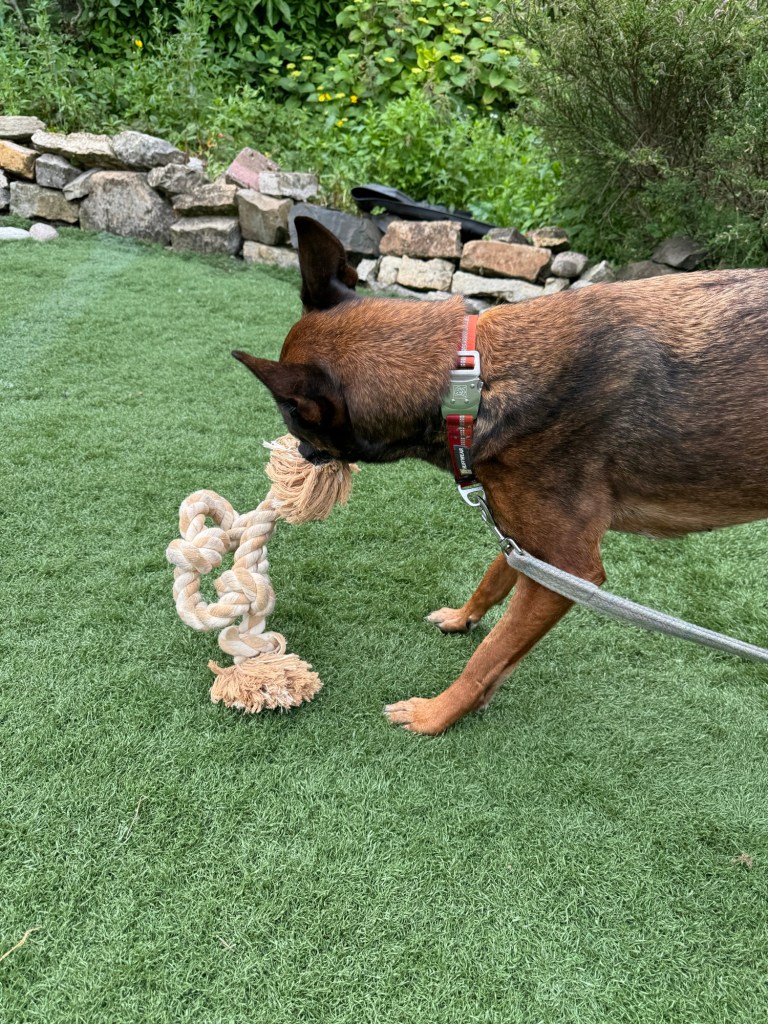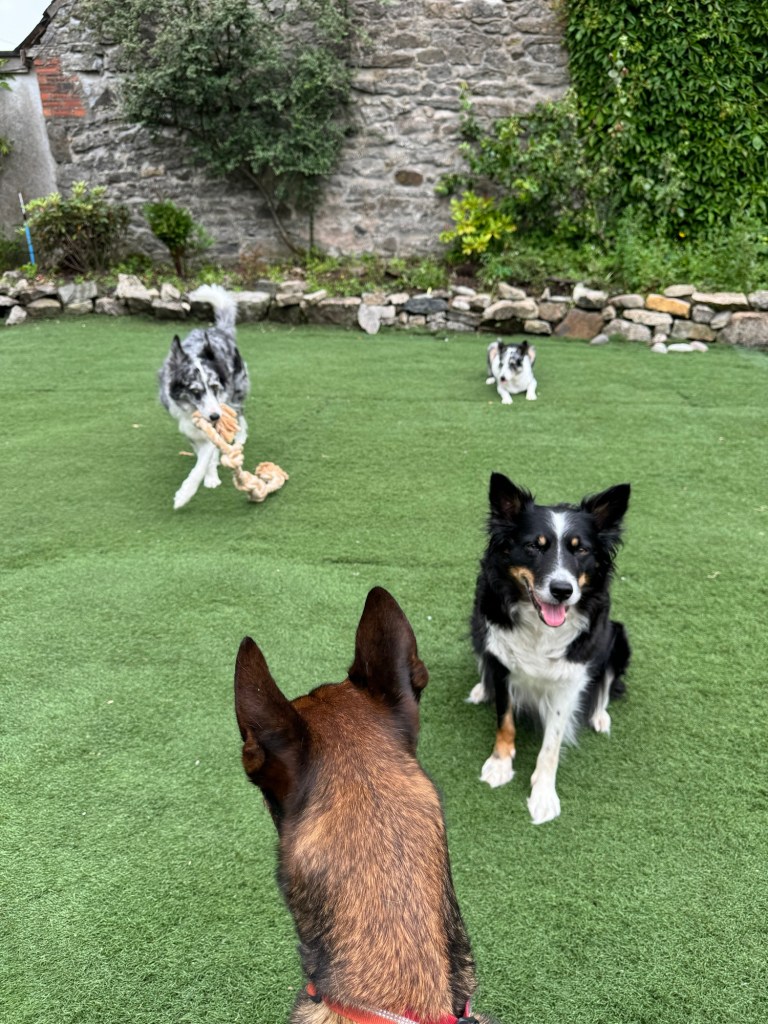 I’m playing with the dogs outside but poor Khaleesi is anxious to join in today, but she can’t. It must be so frustrating for her.
