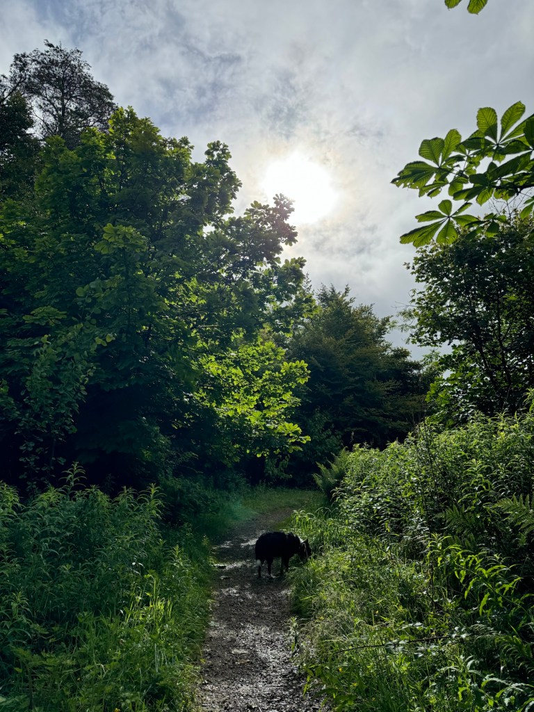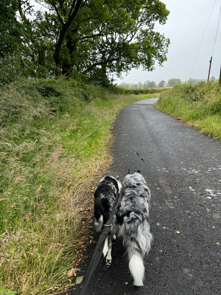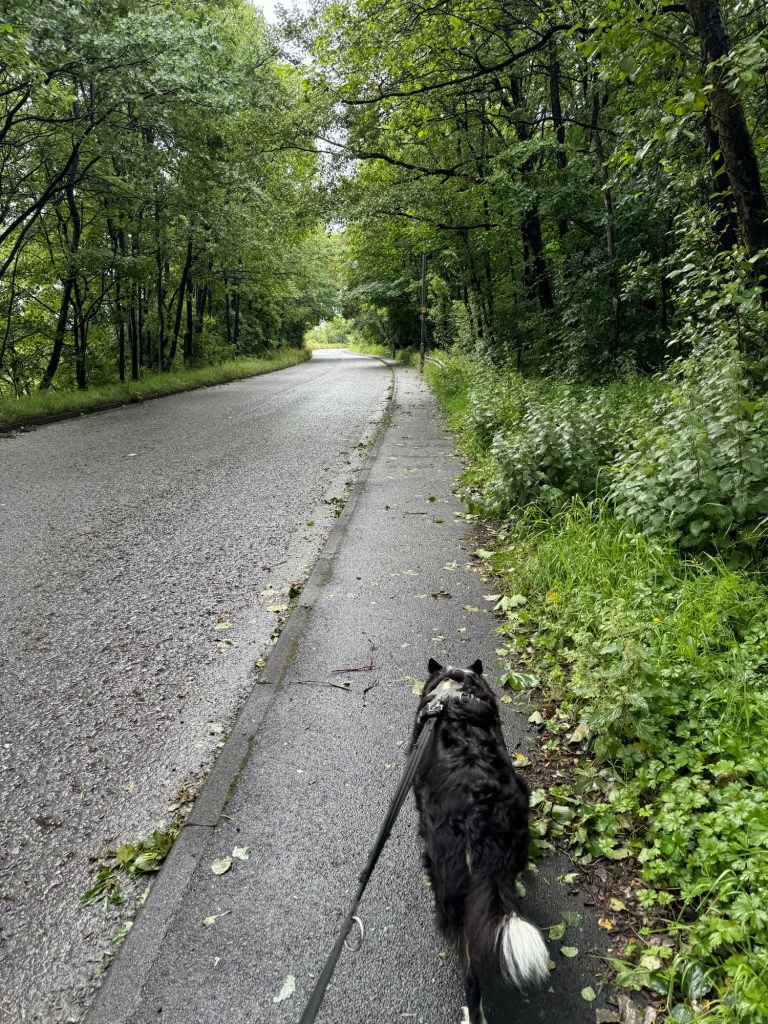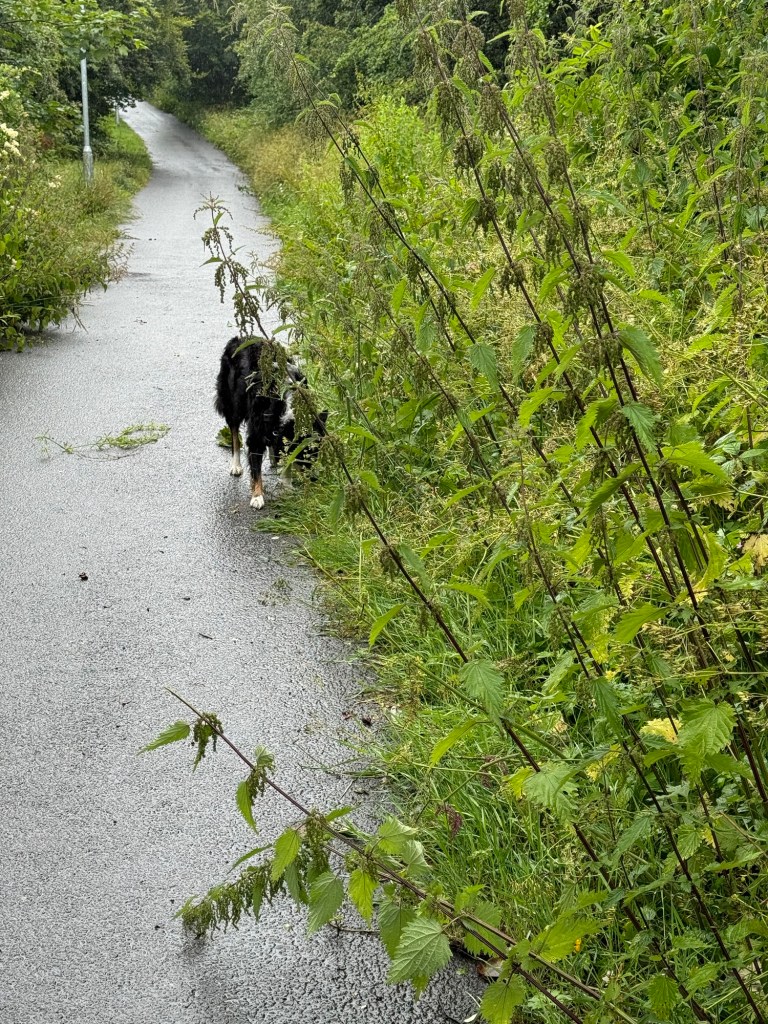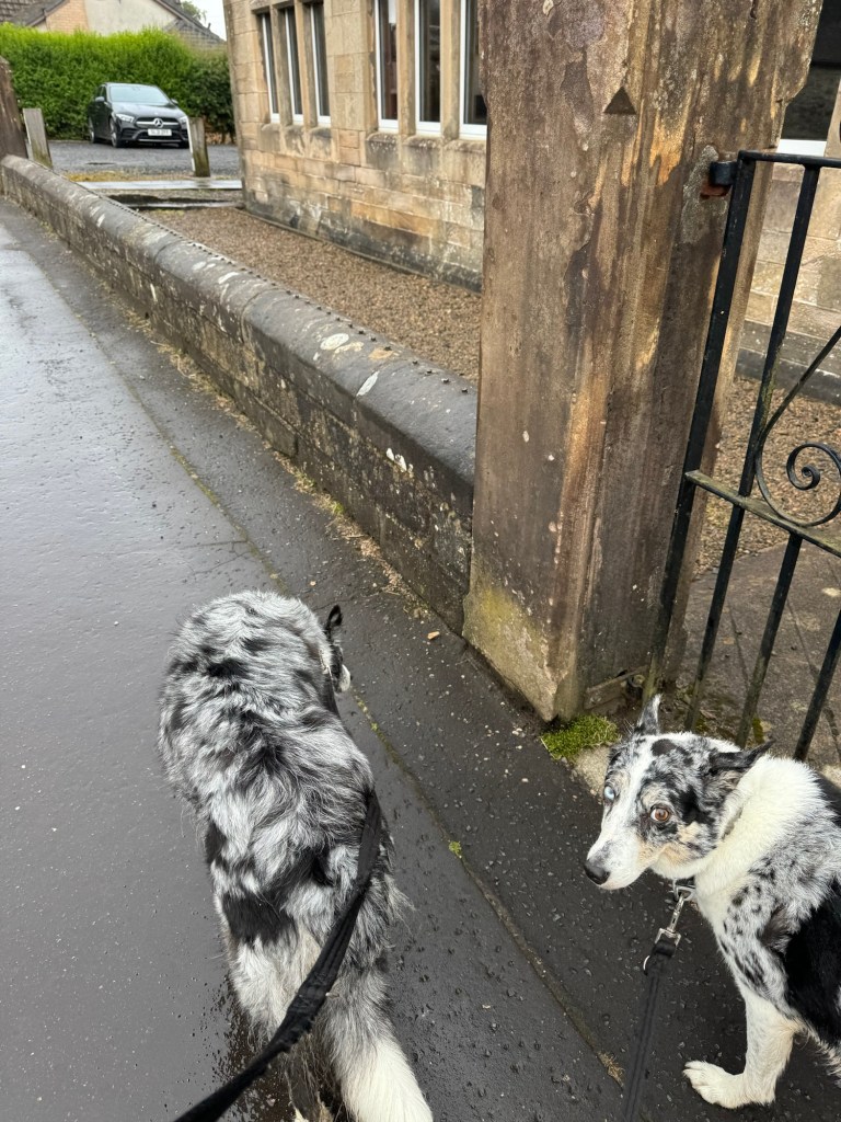 I had to drop Bertie Beetle at the garage this morning for a potential slow puncture and itās still creaking and groaning after having the passenger side spring replaced. So I took Calaidh with me and we had a lovely walk back up in the rain.
