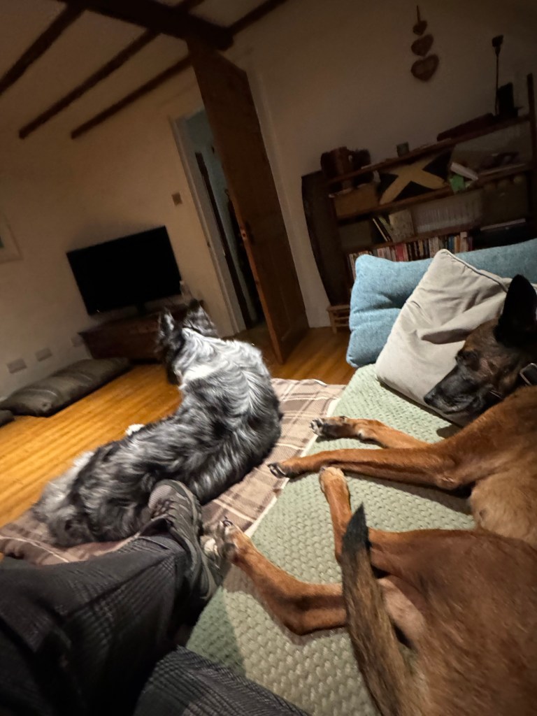Then I took Calaidh and Freya for a big walk. The sun looks so lovely in the sky but it’s only about 3-4°C. It is cold.
