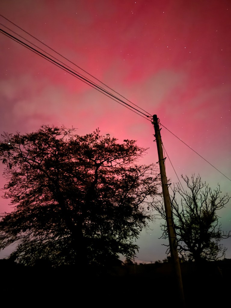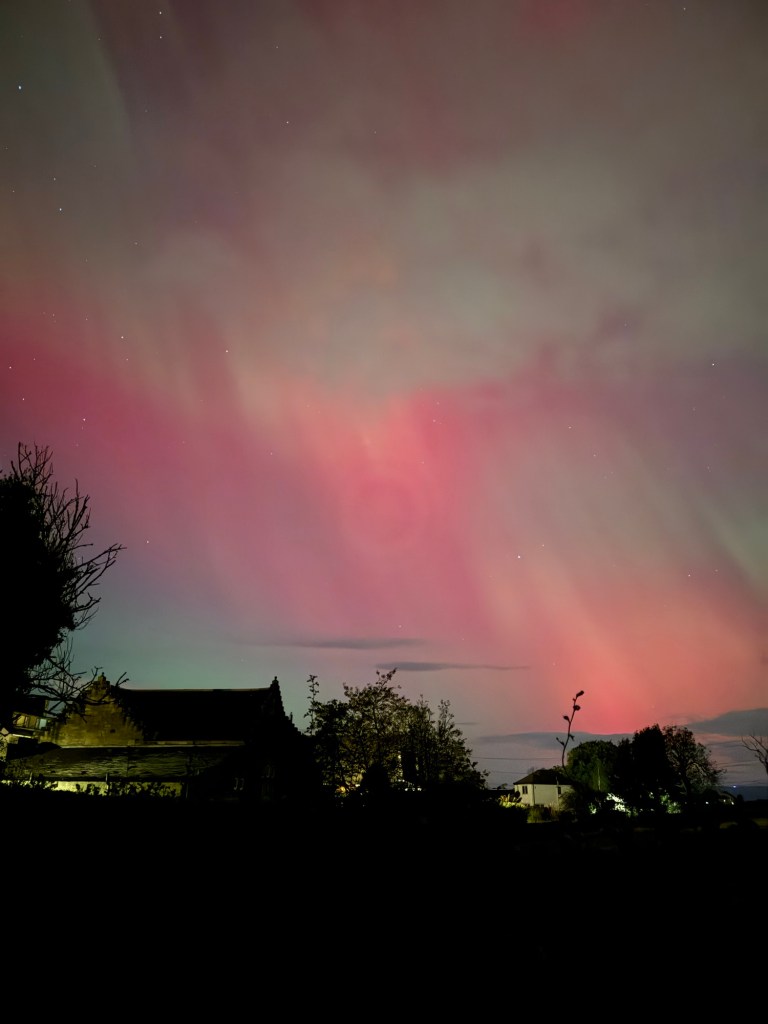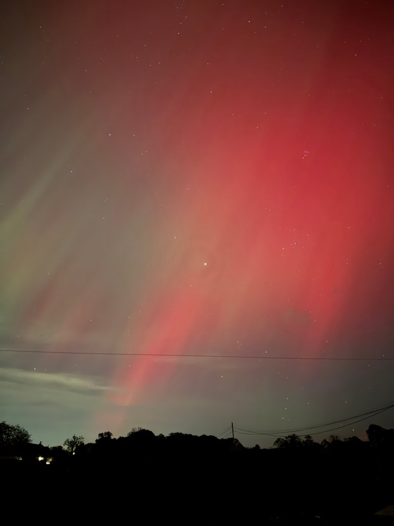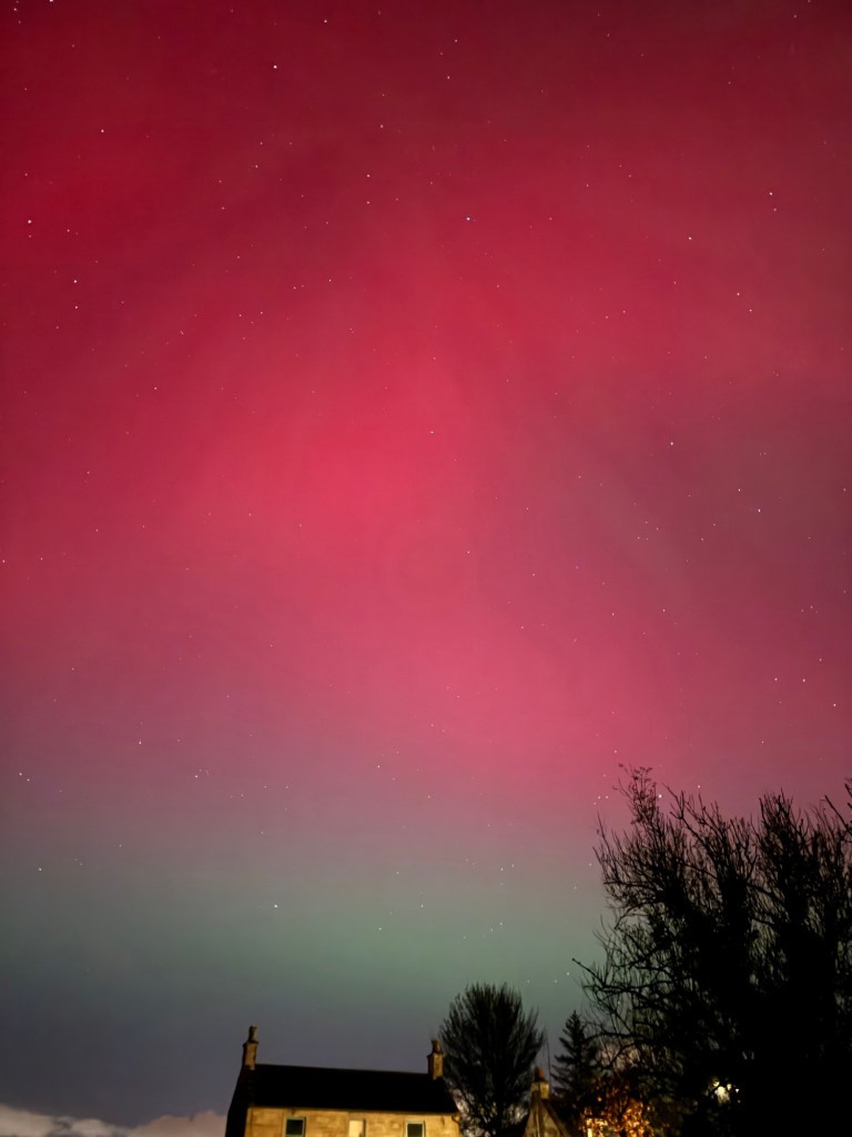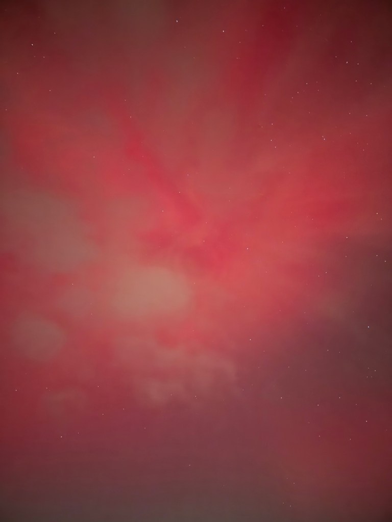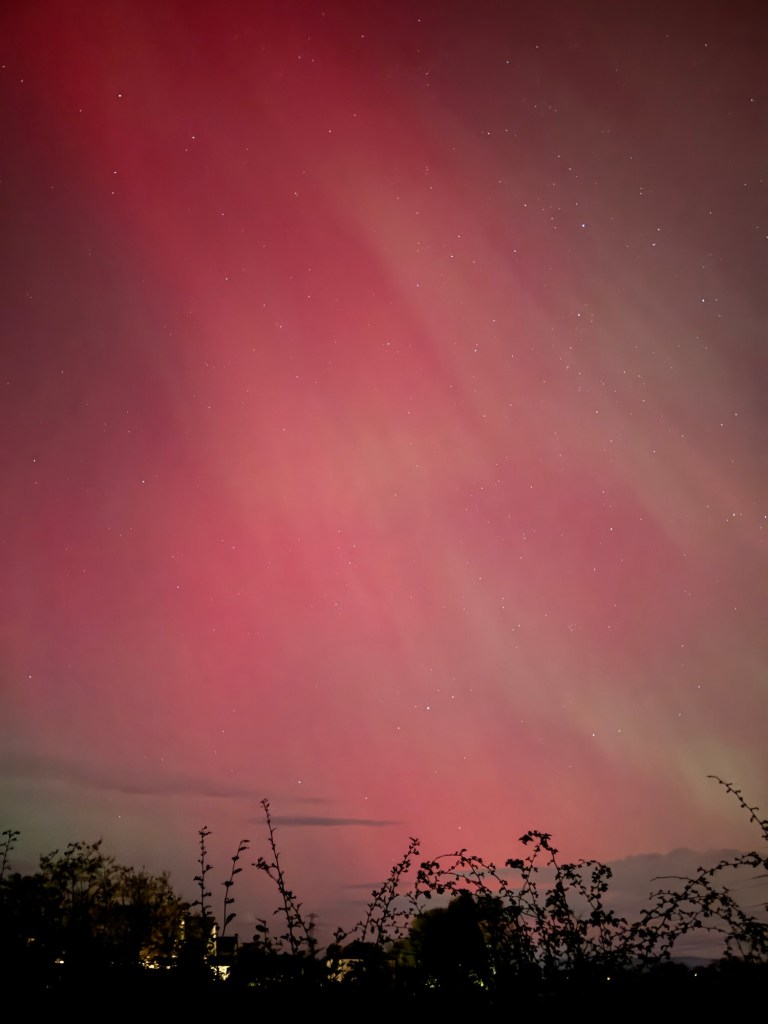 I’m fast asleep when Craig comes up to bed at 12.30 and I get up for the loo…. My brother has posted some very vibrant shots above his house, on our family chat so I head out into the back garden and it’s there above our house and all over the sky, visible to the naked eye. Red.