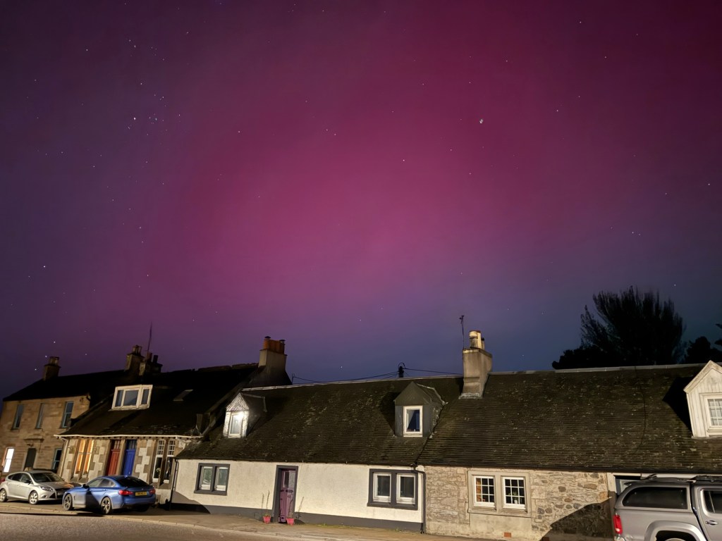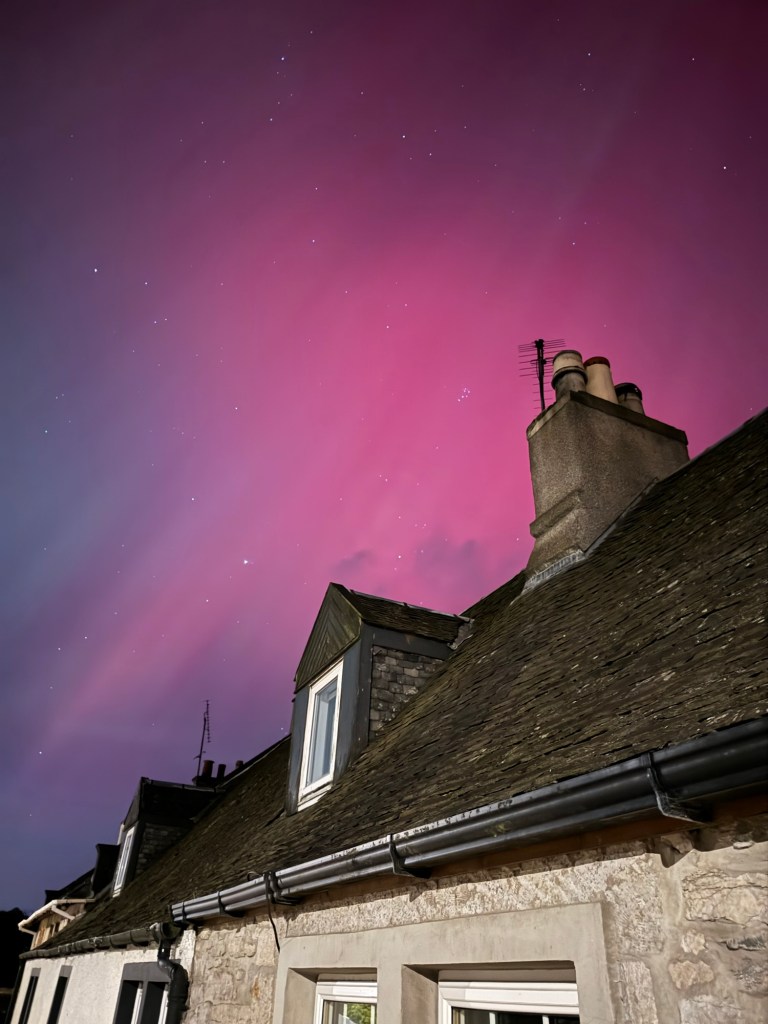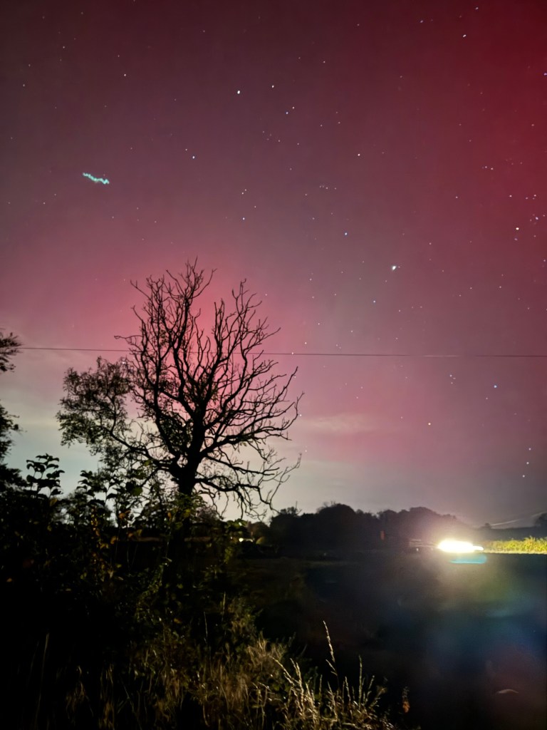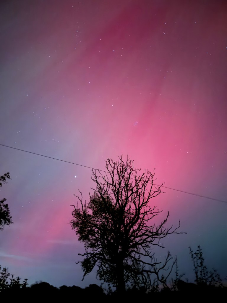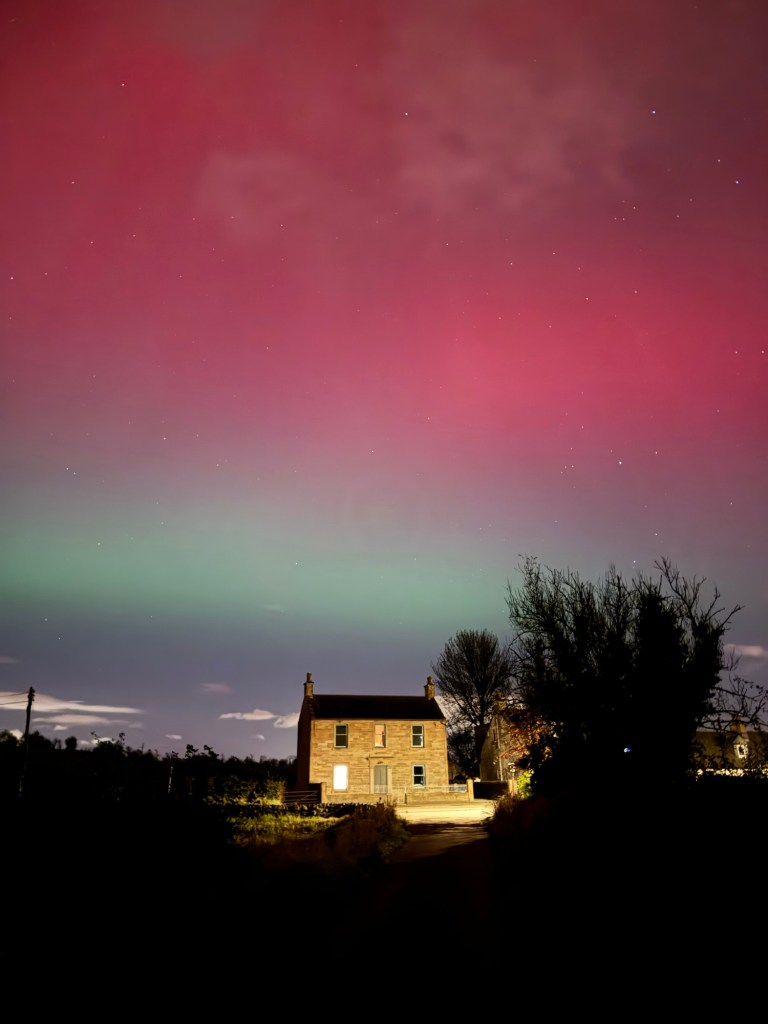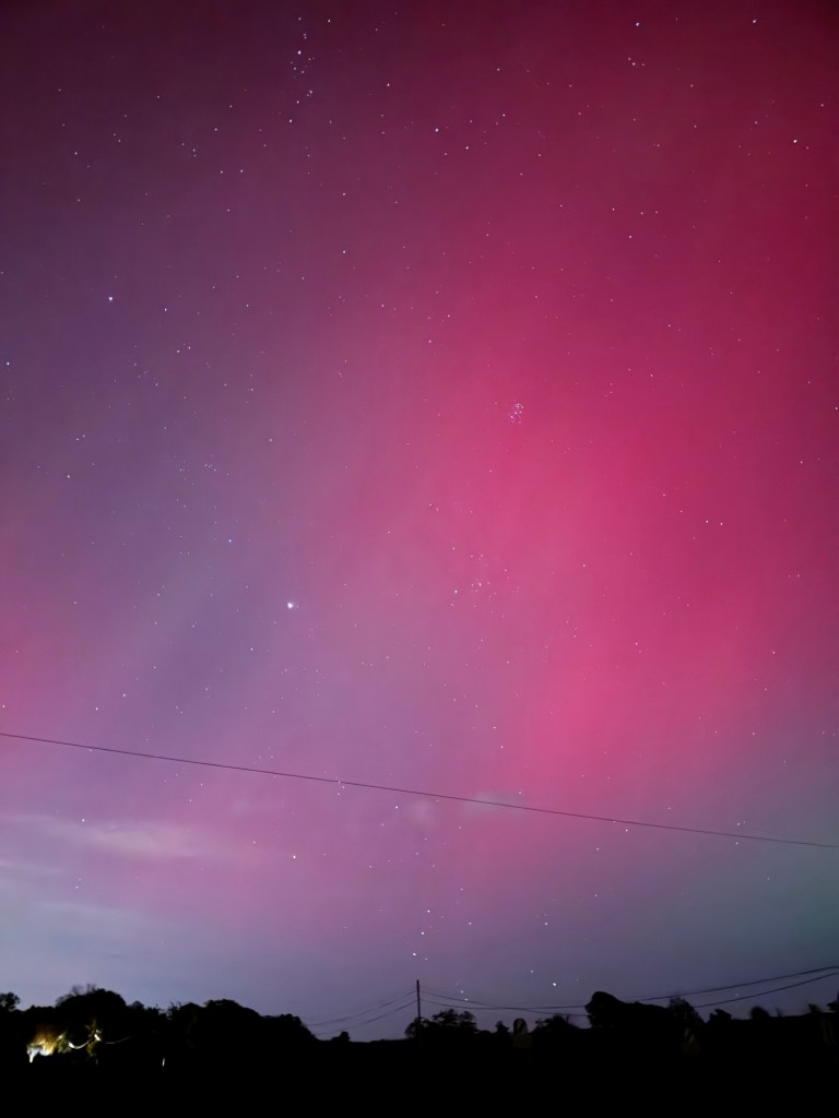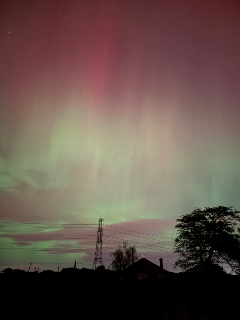 I’m fast asleep when Craig comes up to bed at 12.30 and I get up for the loo…. My brother has posted some very vibrant shots above his house, on our family chat so I head out into the back garden and it’s there above our house and all over the sky, visible to the naked eye. Red.