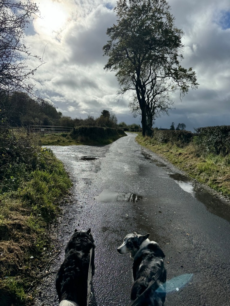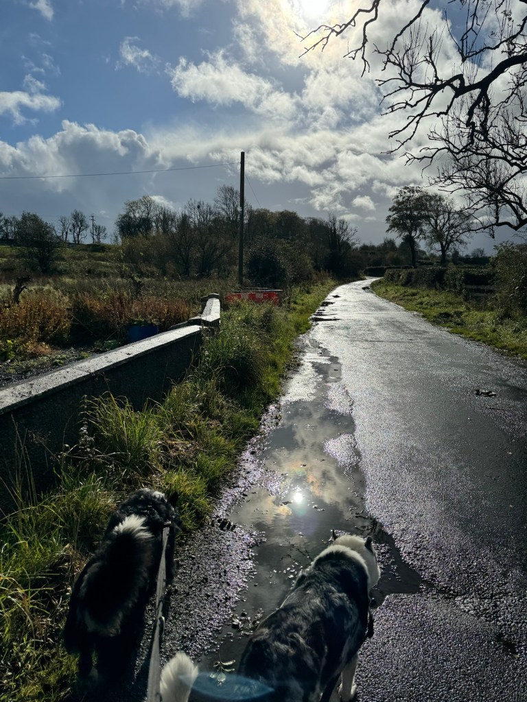 I had some lunch and finally caught a dry spell, managed to get the dogs out before 2pm. The sun even made an appearance! Love the reflection in the puddle.