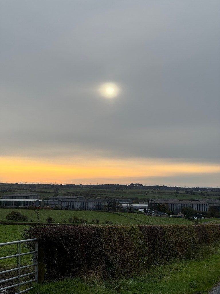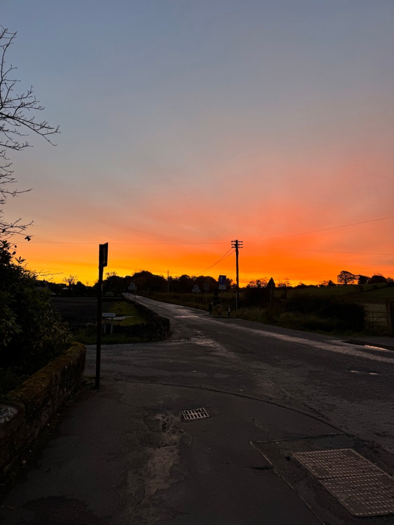 I woke this morning to a lovely red glow on the wall of the room…. I looked out and saw this… not the best photo but you get the idea!