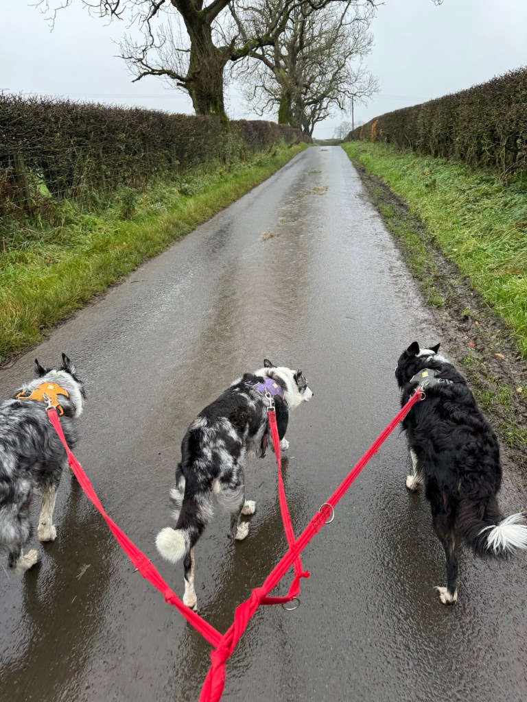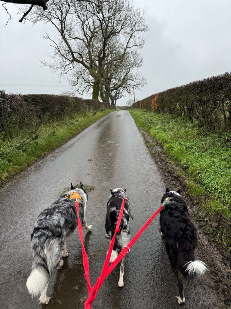 The dogs are filthy after just a long lead walk⦠the roads are really dirty with all the rain. They look in every field on the way past, as if to say, can we go in there for a run?!? Not likely in that mud!!