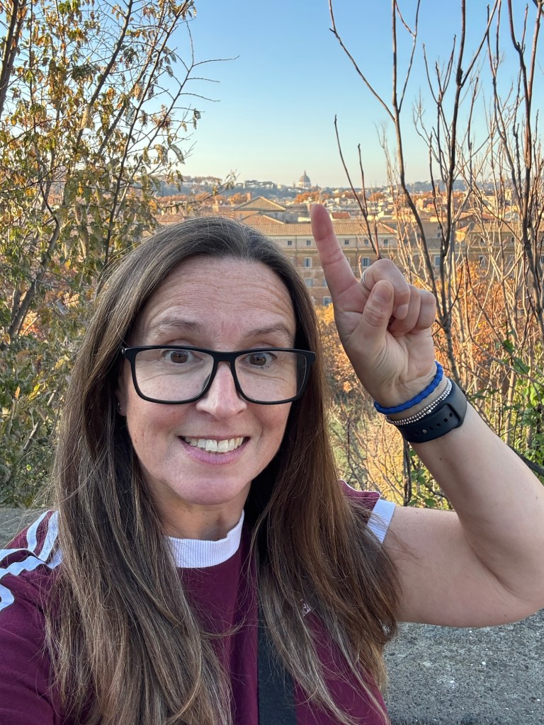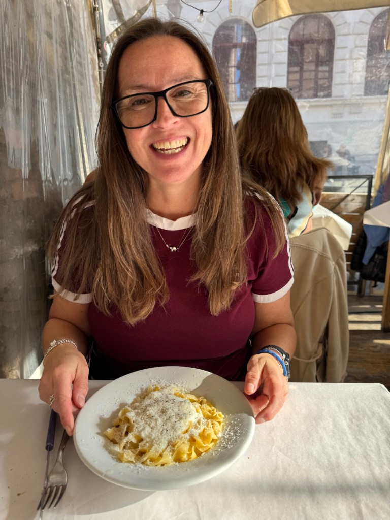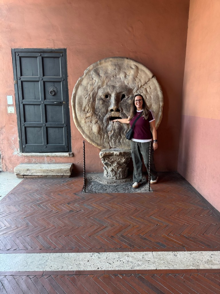 To the Bocco della Verita – the Mouth of Truth – which is an ancient Roman marvel mask. Legend has it, it used to eat the arm of those who told lies. I am pleased to report I escaped unscathed. 😆