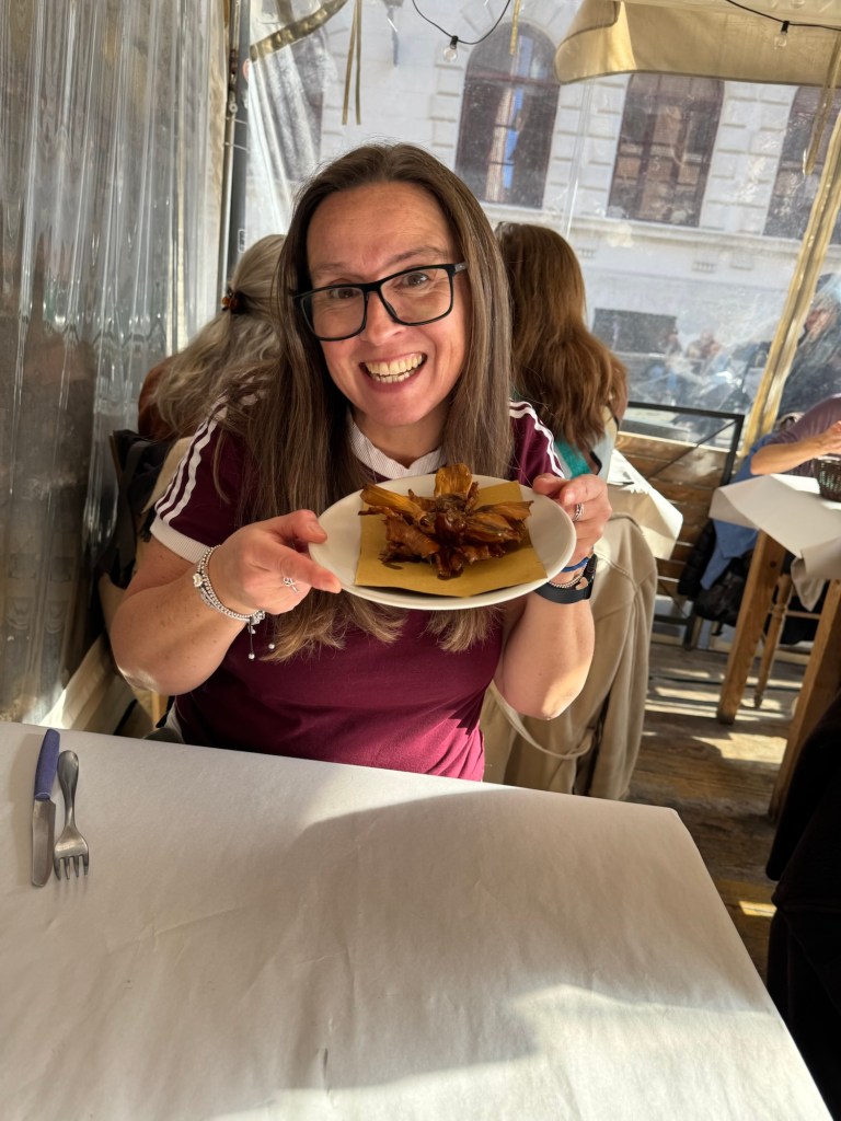 Here I am modelling the Jewish delicacy fried artichoke.
