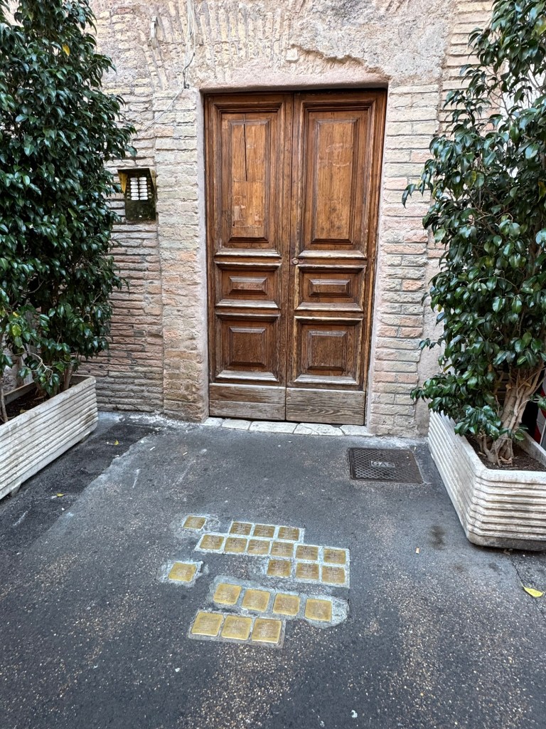 These gold plaques are frequently found on the pavements in Italy. They signify the Jewish residents of that home that were rounded up and transported to Auschwitz or other death camps. Very sobering.