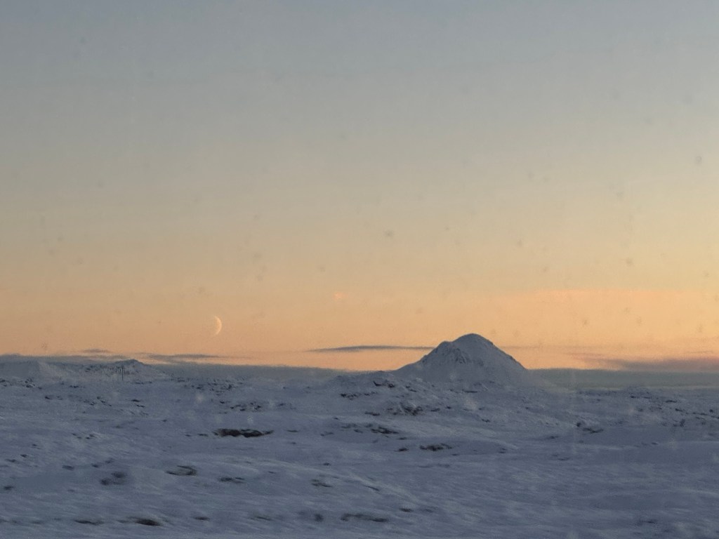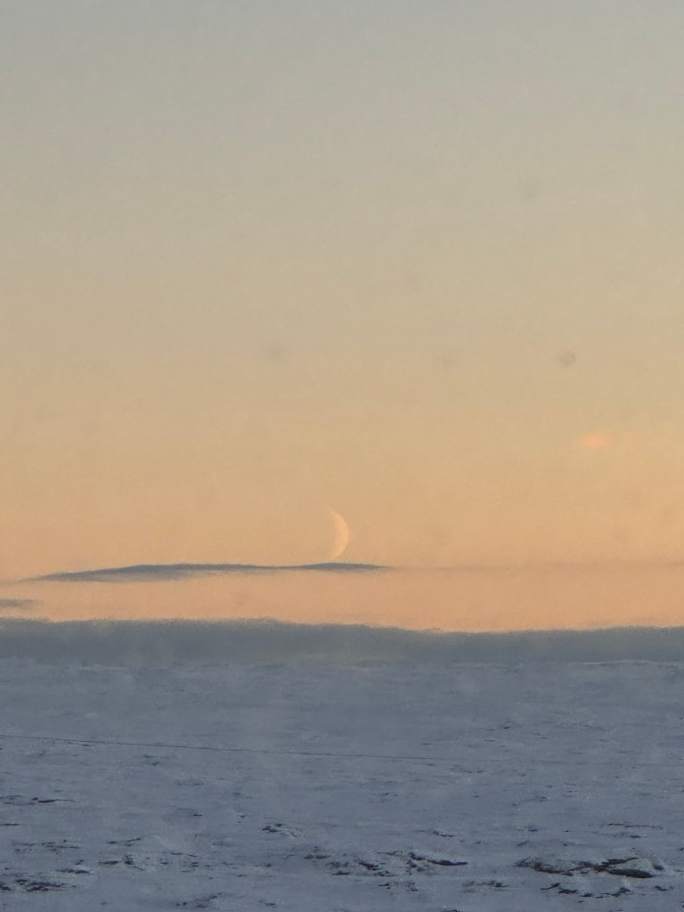 The landscape is stunning. It’s so different from when we saw it in May 2023. The snow makes everything seem so much bigger. If you look to the left of the hill,797 will see the crescent of the moon. 🌙
